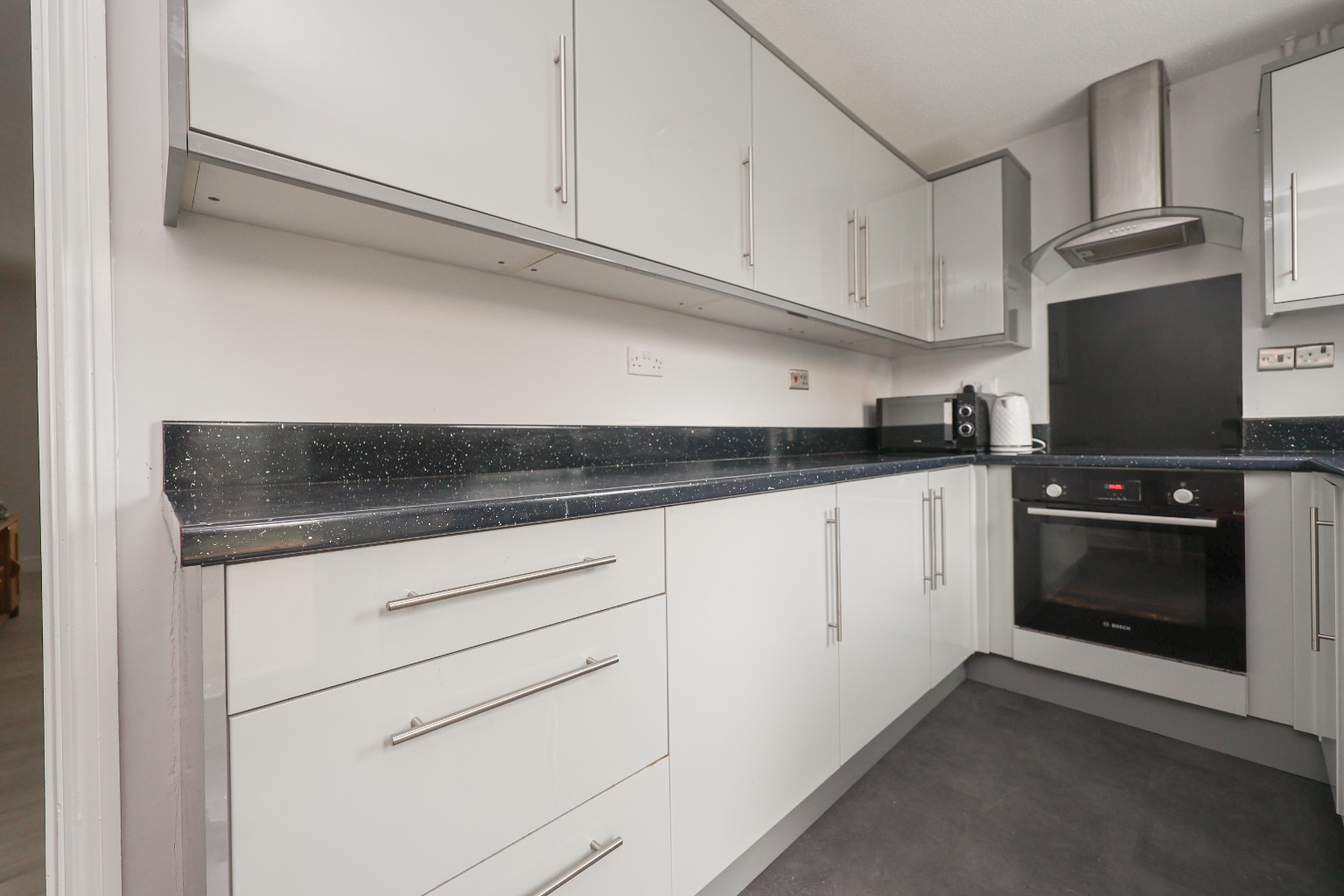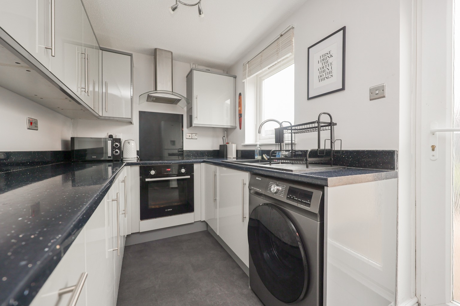 The living room (5.20m x 3.90m) is a spacious, light and welcoming reception room positioned to the front of the property. A large window allows natural light to fill the space, while the room also benefits from a wall-mounted panel radiator, TV and telephone points, two understairs storage cupboards, and stairs rising to the first floor. A door leads through into the kitchen. The kitchen (3.90m x 2.10m) is fitted with a modern range of base and eye-level units with complementary work surfaces incorporating a sink and drainer with mixer tap. There is space and plumbing for a washing machine, space for a fridge freezer, and an electric oven with hob and cooker hood. Finished with tiled flooring and a wall-mounted panel radiator, the kitchen enjoys a rear-facing window and a door opening directly onto the garden.
