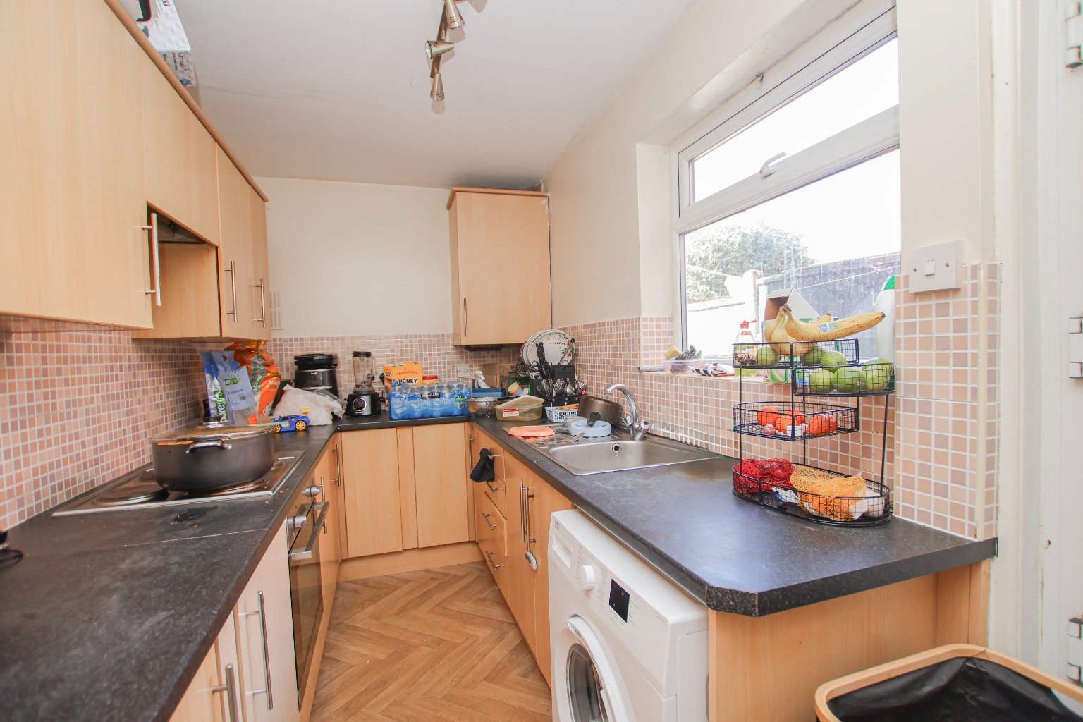 The property is entered via the front door into a spacious lounge diner measuring approximately 6.9m x 3.5m. This generous reception space features carpeted flooring, radiators, plenty of power sockets and a window overlooking the rear garden, creating a bright and practical room with ample space for both seating and dining furniture. Leading through from the lounge diner is the kitchen, measuring approximately 3.8m x 1.8m. The kitchen is fitted with a range of wall and base units, an oven with four ring gas hob, space for a washing machine and windows overlooking the rear garden. A rear door also provides direct access outside. The staircase rises from the ground floor and is carpeted and presented in good condition.