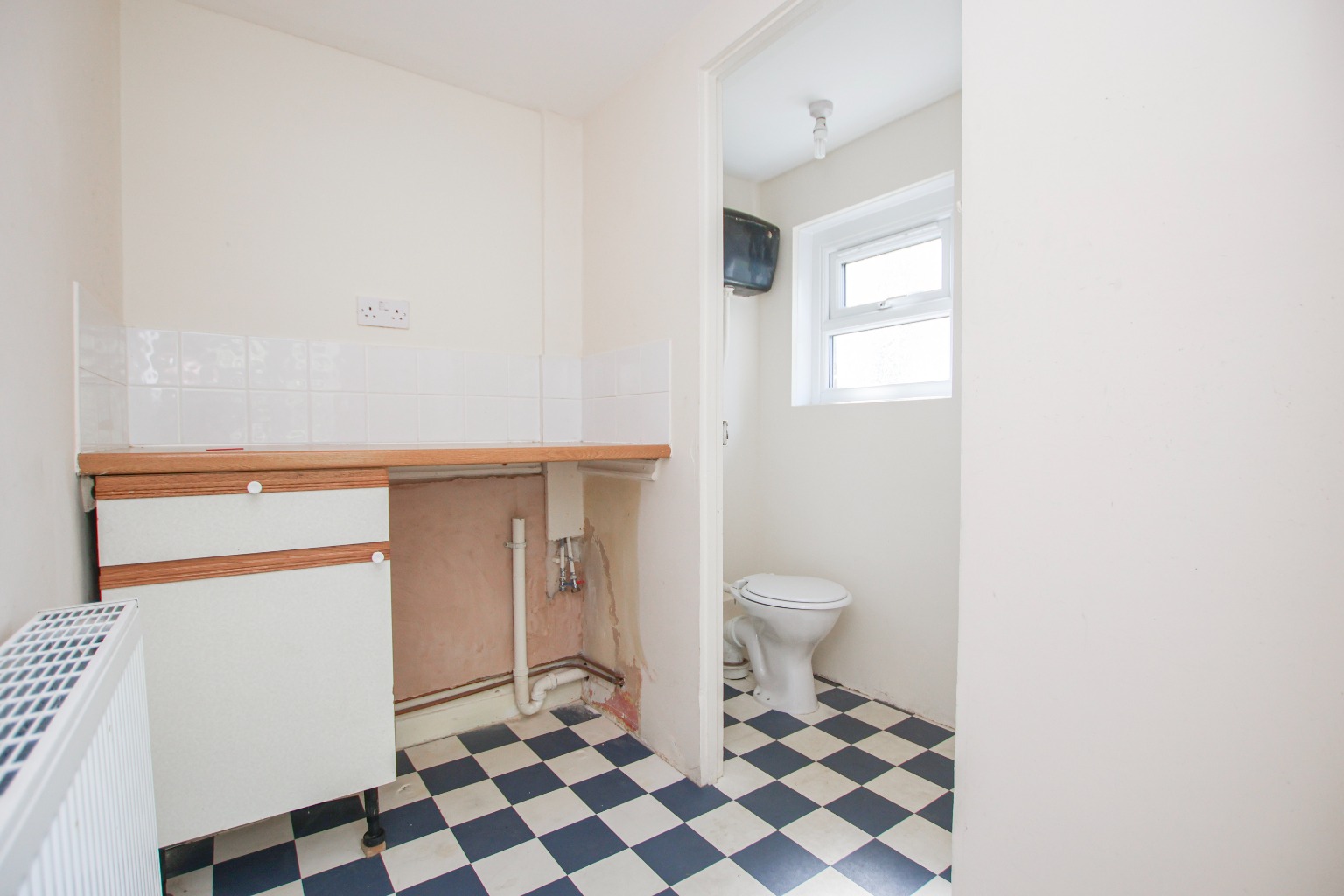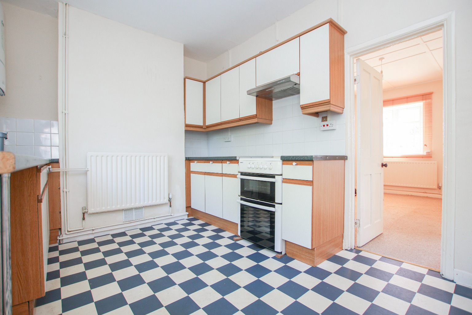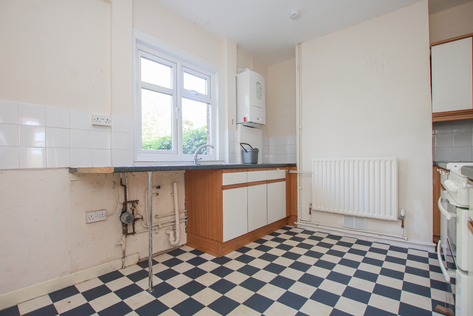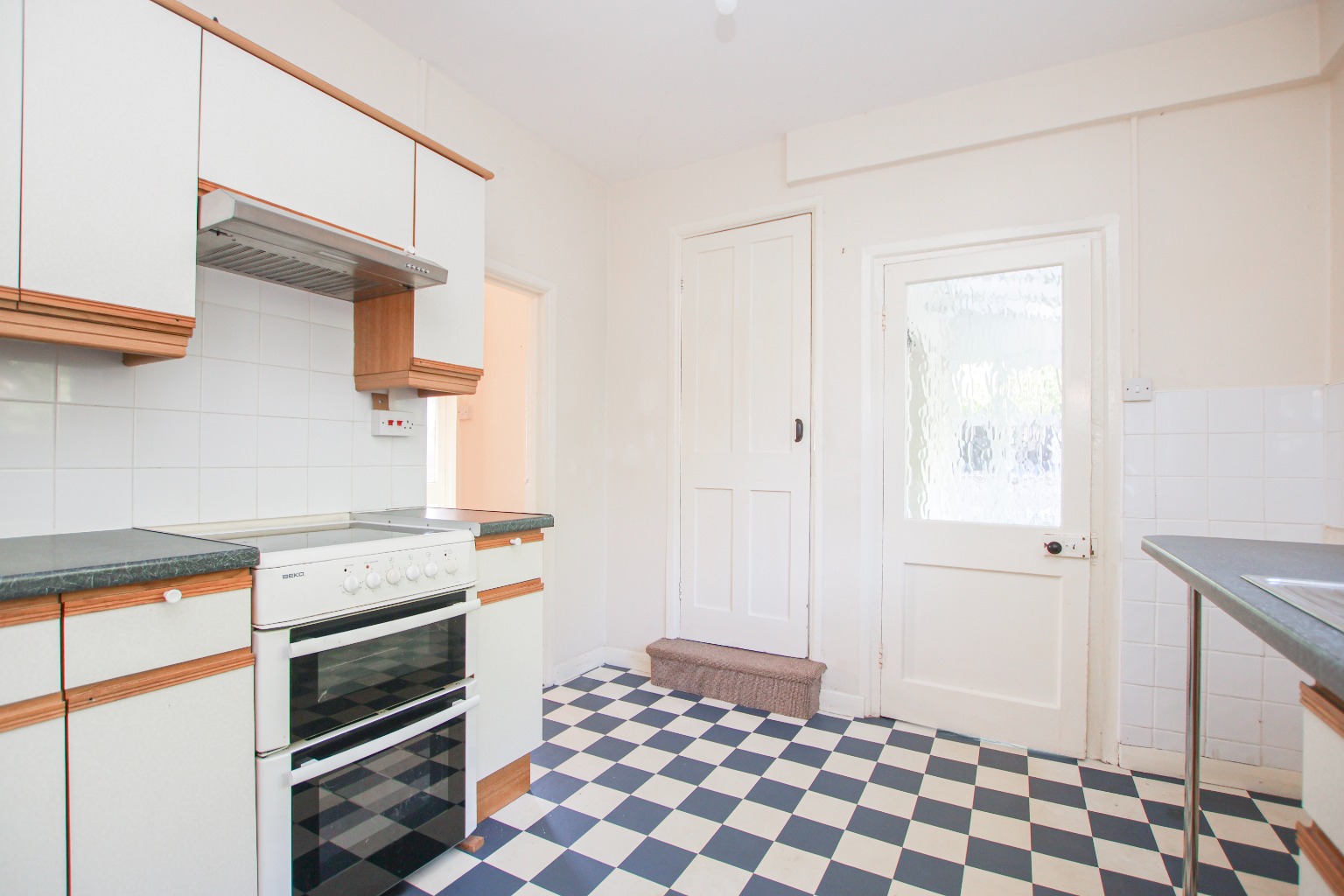 The kitchen, sized at 4.28m x 3.60m (14'1" x 11'10"), is fitted with a range of wall and base units, offering ample storage and workspace. From here, there is access to the rear of the property and into the garden, making it a practical and functional space for day-to-day living.