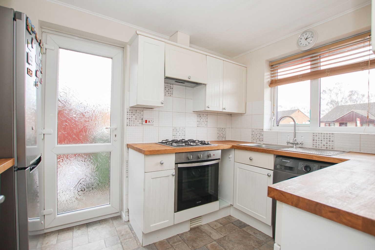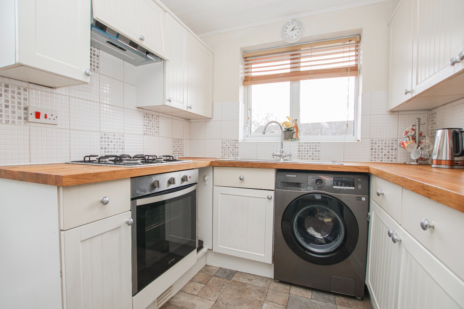 The kitchen is fitted with a range of wall and base units, offering ample storage and workspace. There is an integrated oven, space for a washing machine and a freestanding fridge freezer, with lino flooring providing a practical finish.
