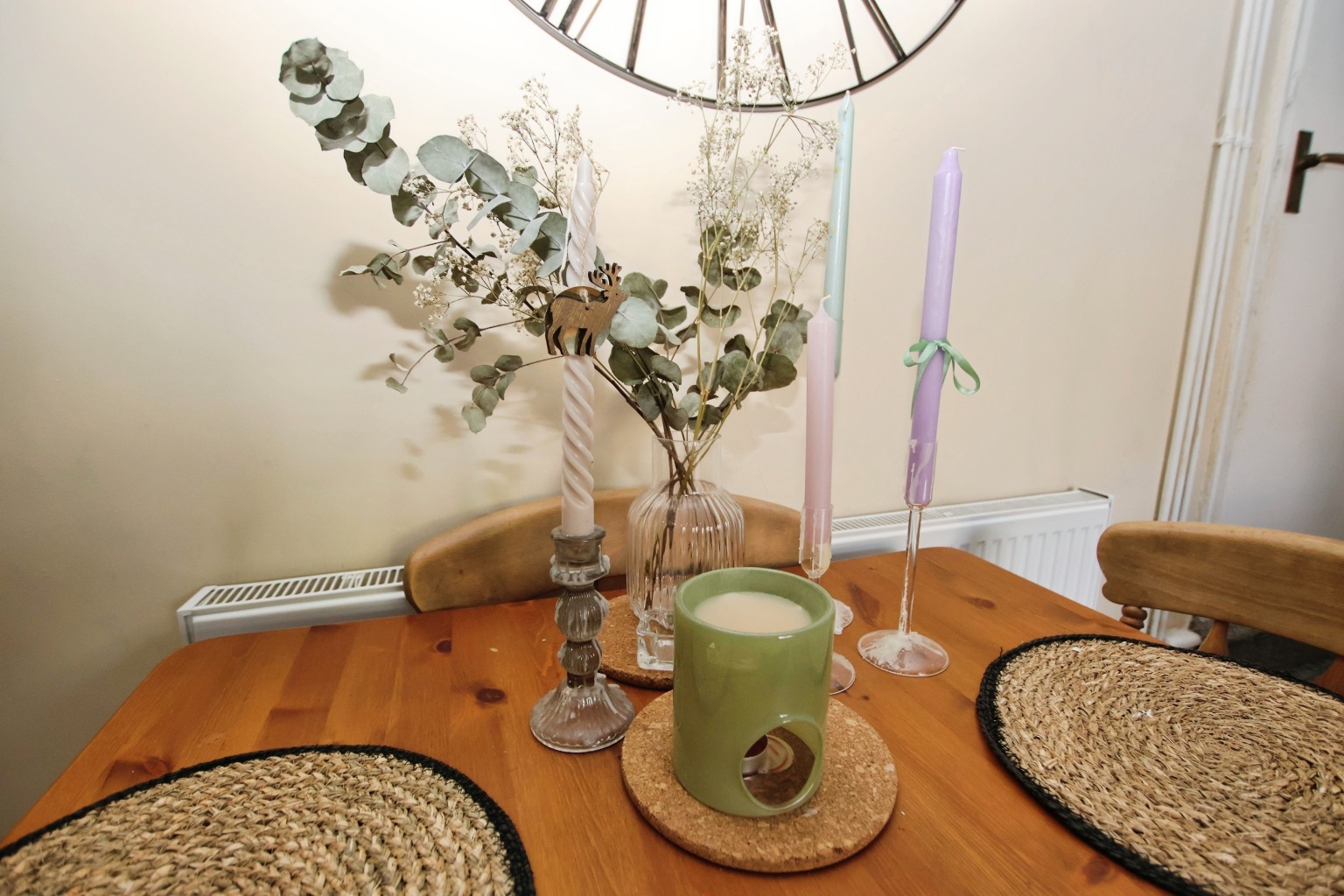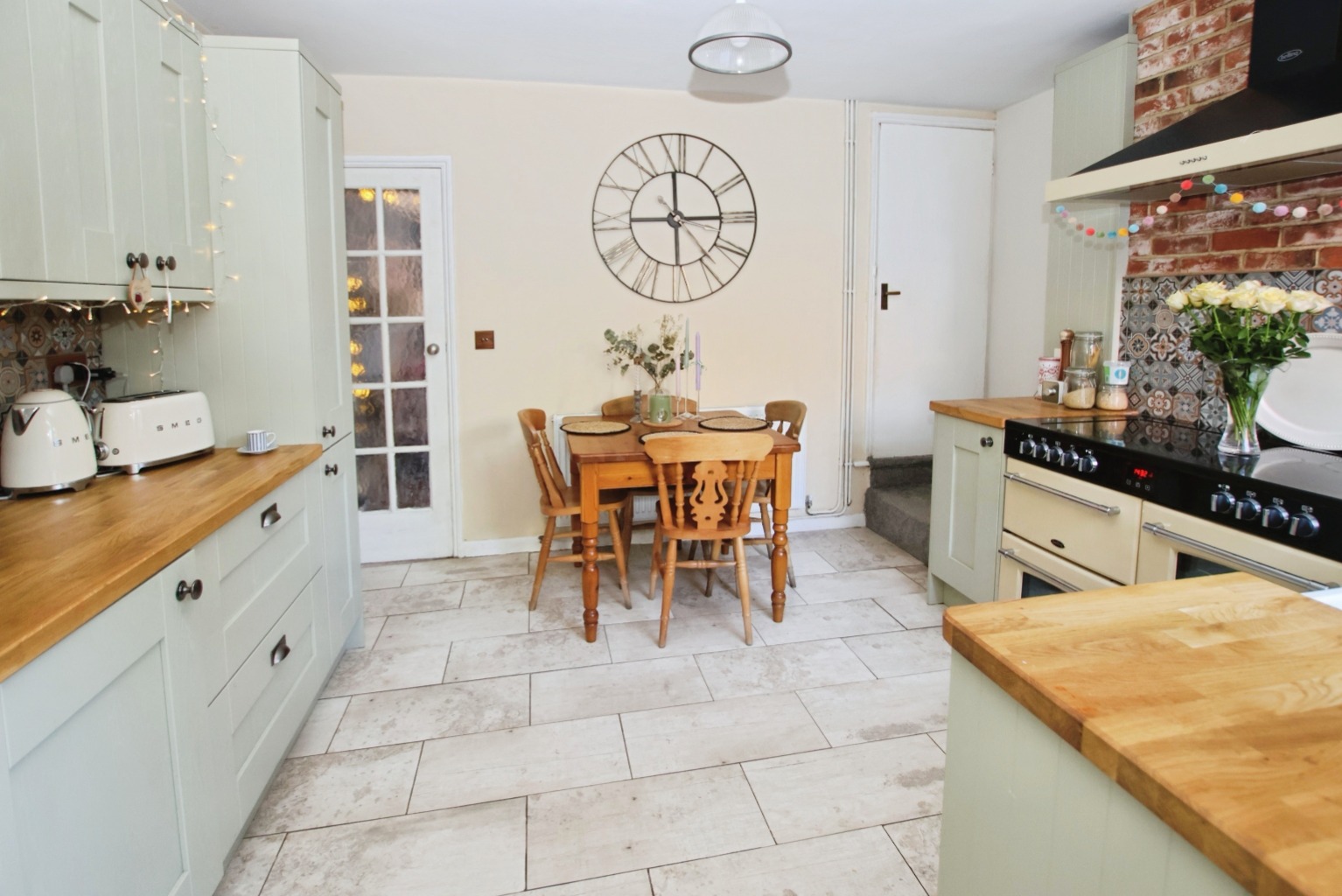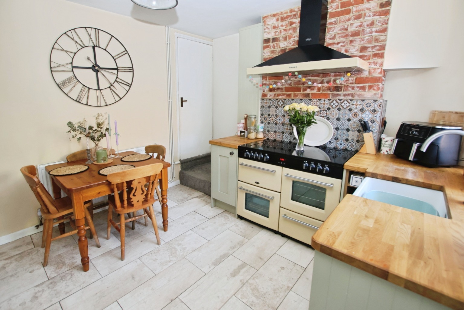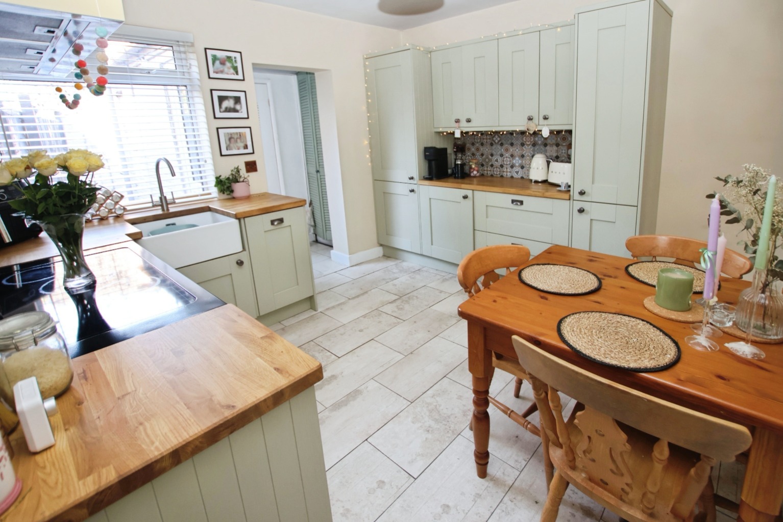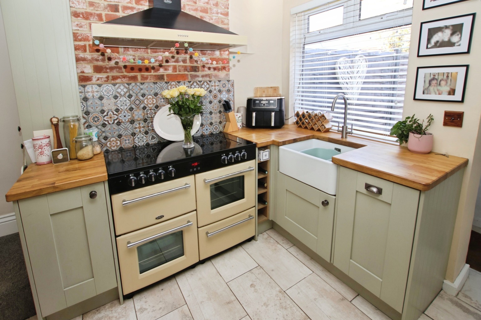 To the rear of the property is the kitchen/diner, offering a great amount of storage and worktop space, along with plenty of room for a dining table, making it ideal for everyday living and entertaining. The kitchen itself is beautifully styled with shaker units, wooden worktops, tiled flooring and feature splashbacks, creating a space that is both practical and full of character. It is fitted with a range cooker, Belfast sink, integrated fridge/freezer and integrated bins, while a rear lobby provides additional practicality with space and plumbing for a washing machine, along with access to the boiler.