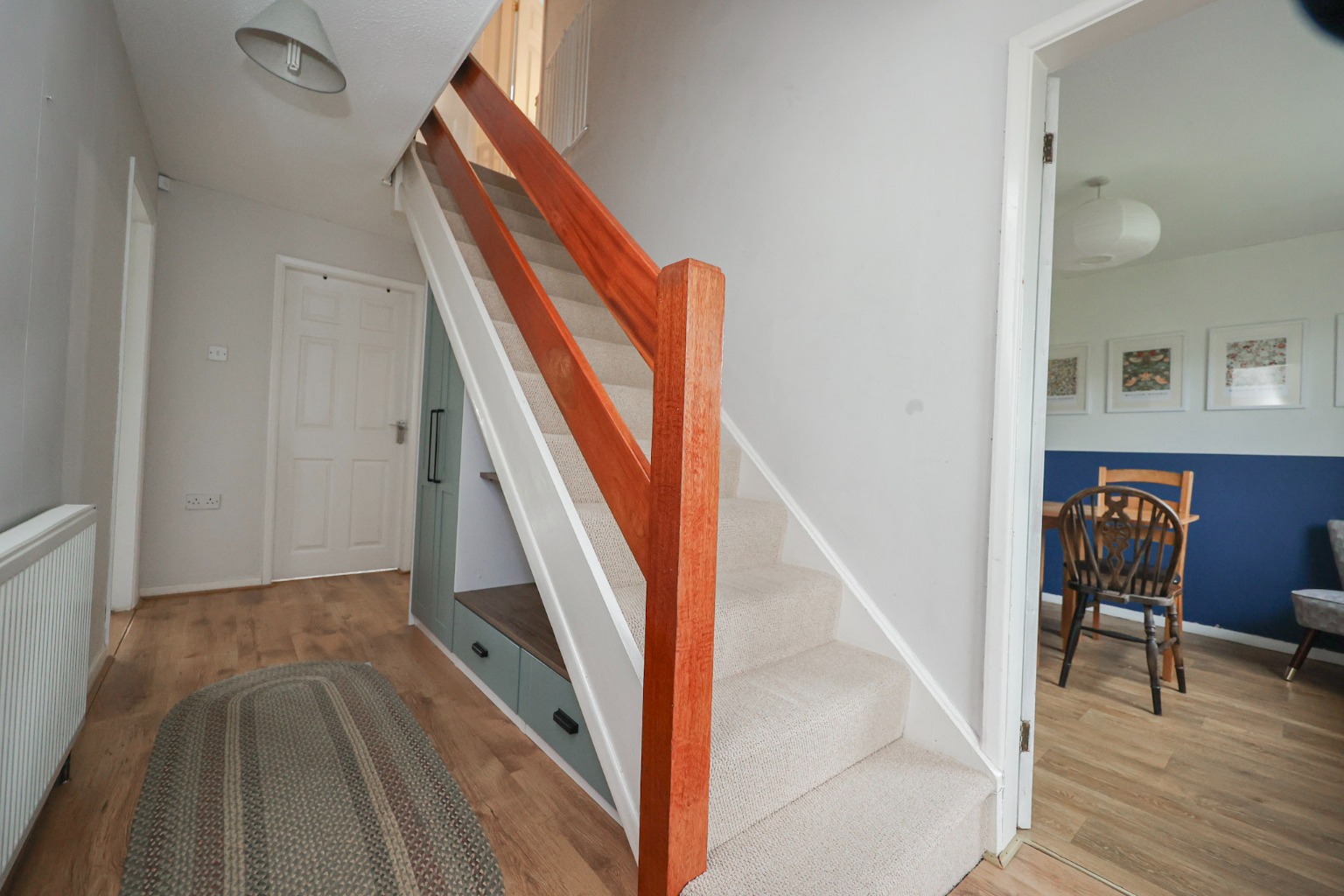 The property is accessed via a welcoming entrance hallway, finished with laminate flooring and a wall-mounted radiator. A built-in under-stairs storage cupboard provides excellent space for coats, shoes and household items, with additional hanging space for ironing boards and everyday essentials.