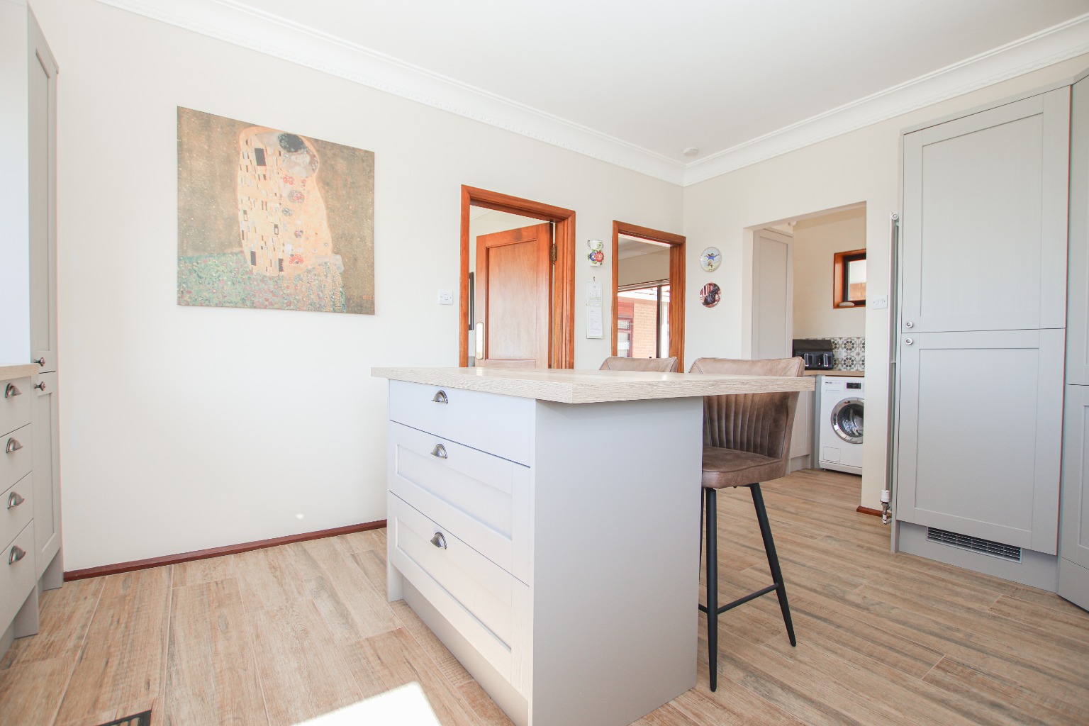 Flowing from the kitchen is a useful utility room, fitted with additional units, sink and drainer, and space for further appliances, ensuring the main kitchen remains sleek and uncluttered.