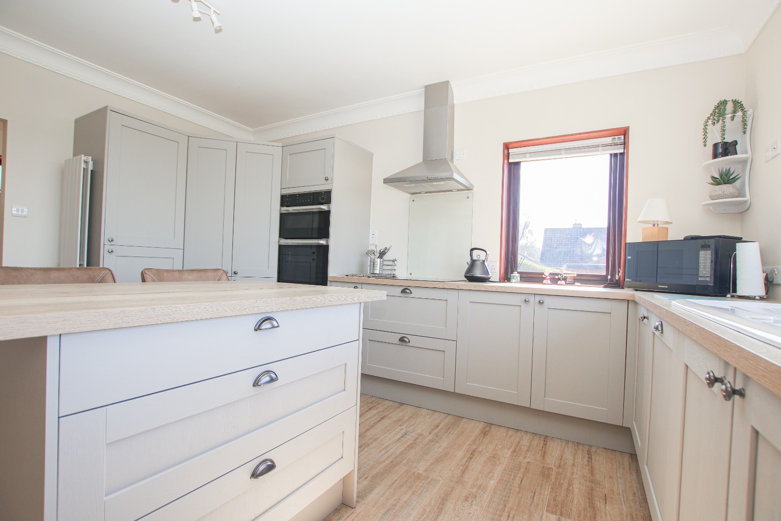 The kitchen is a real highlight of the home, combining practicality with style. Fitted with an extensive range of wall and base units, it includes integrated appliances such as a dishwasher, fridge freezer, and double ovens, alongside generous worktop space. The positioning of the kitchen allows you to fully appreciate the panoramic views, making everyday living feel exceptional.