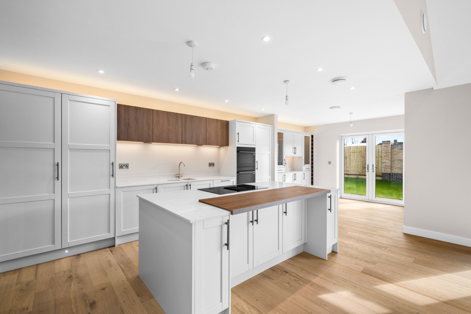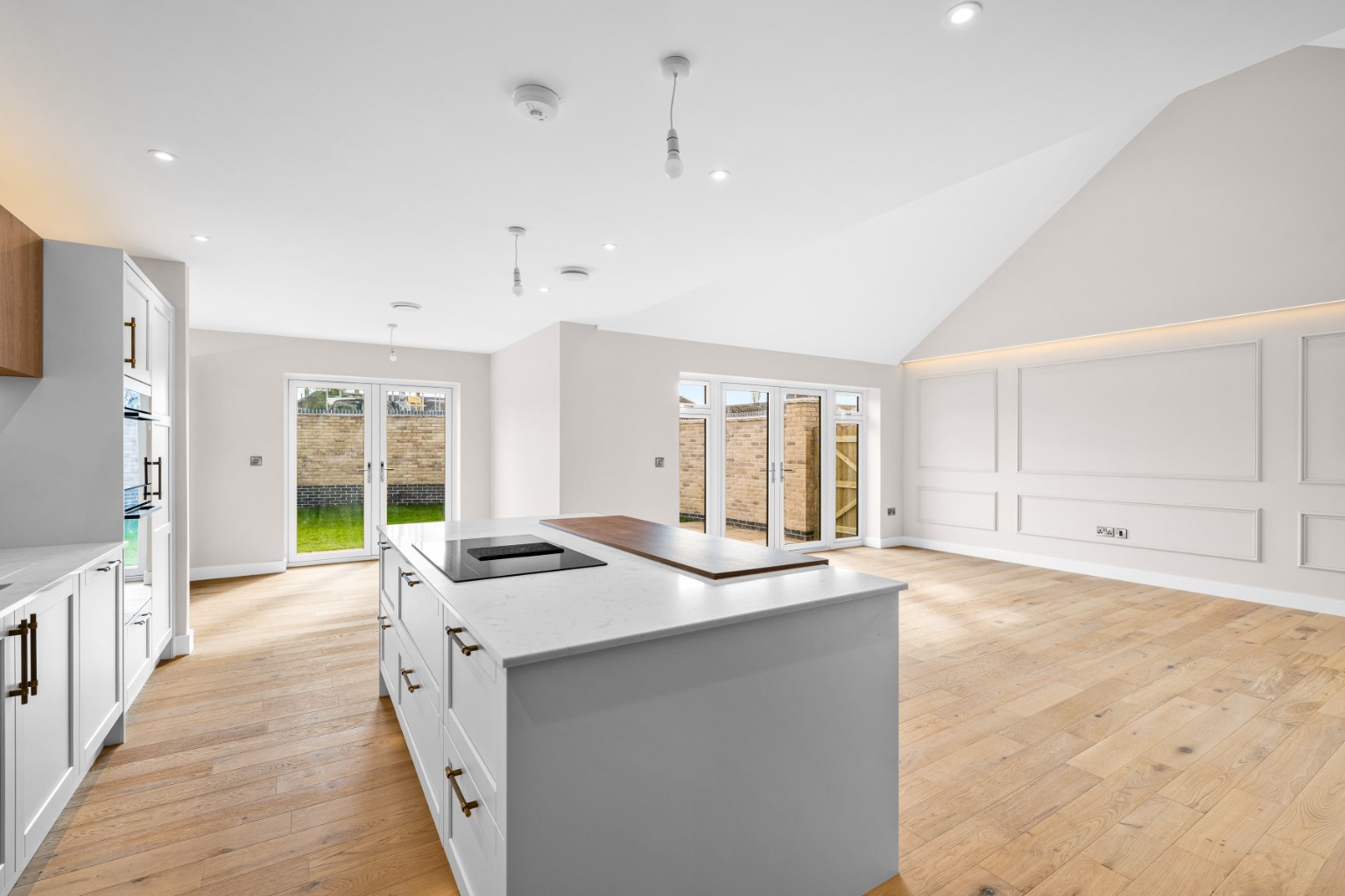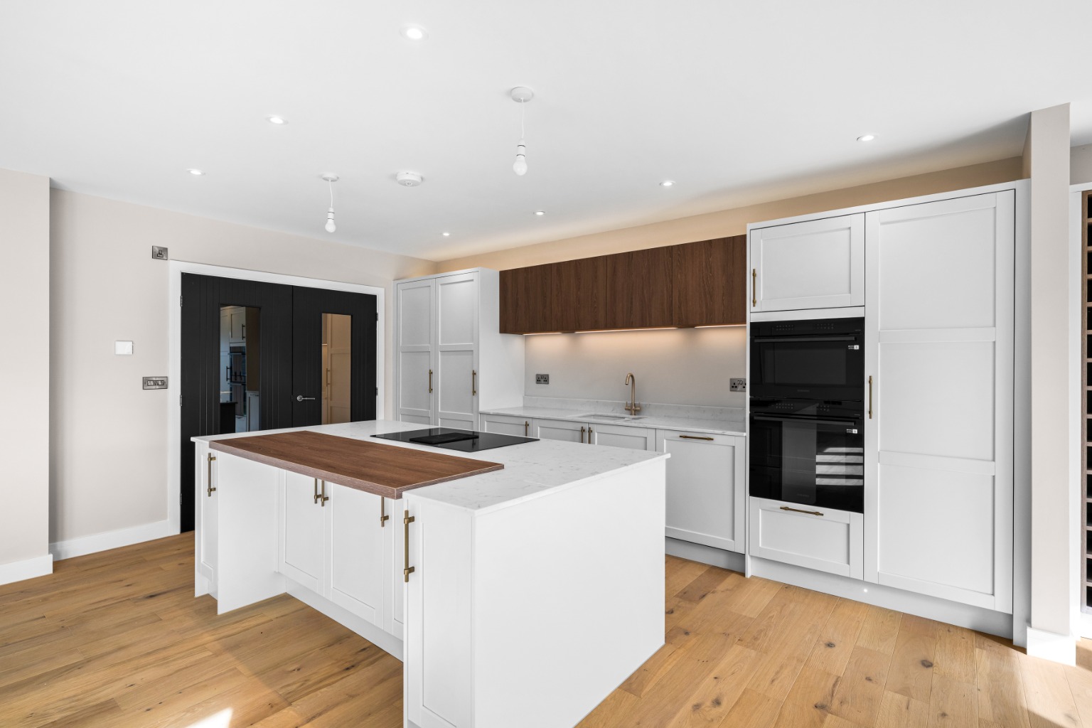 A double-width feature island anchors the space, ideal for entertaining or informal dining, while integrated Samsung appliances include a double oven, induction hob with extractor, dishwasher, and full-height fridge and freezer. Feature lighting completes a kitchen that feels confident, refined and unmistakably high end.