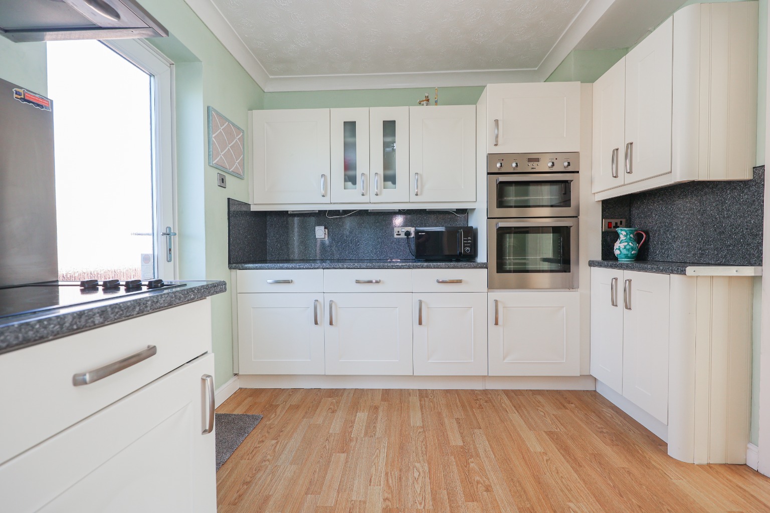 There is a spacious internal hallway, offering laminate flooring, a large side-facing window allowing natural light to flood the space, and access to a useful understairs storage cupboard. The kitchen (3.40m x 2.60m) is fitted with a range of wall and base units with worktops over, complemented by wooden flooring. There is an electric oven and grill, four-ring hob with extractor over, integrated washing machine, stainless steel sink and ample socket points, making it a practical and functional space. Flowing through, the lounge/dining room (4.80m x 3.00m) offers a bright and sociable living environment, benefitting from windows to multiple aspects and French doors opening directly onto the rear garden, ideal for indoor-outdoor living. Additionally, there is a separate front lounge (6.10m x 3.00m), featuring a fireplace, fitted carpet, radiator and large windows to the front aspect, creating a cosy yet spacious second reception area. The ground floor also benefits from a modern shower room (approx. 1.80m x 1.60m), fitted with a shower, WC, wash basin and radiator. A further versatile space is provided via a dressing room (2.30m x 1.90m), leading into bedroom three (3.20m x 2.30m), which includes built-in storage, wood flooring and a window to the side.