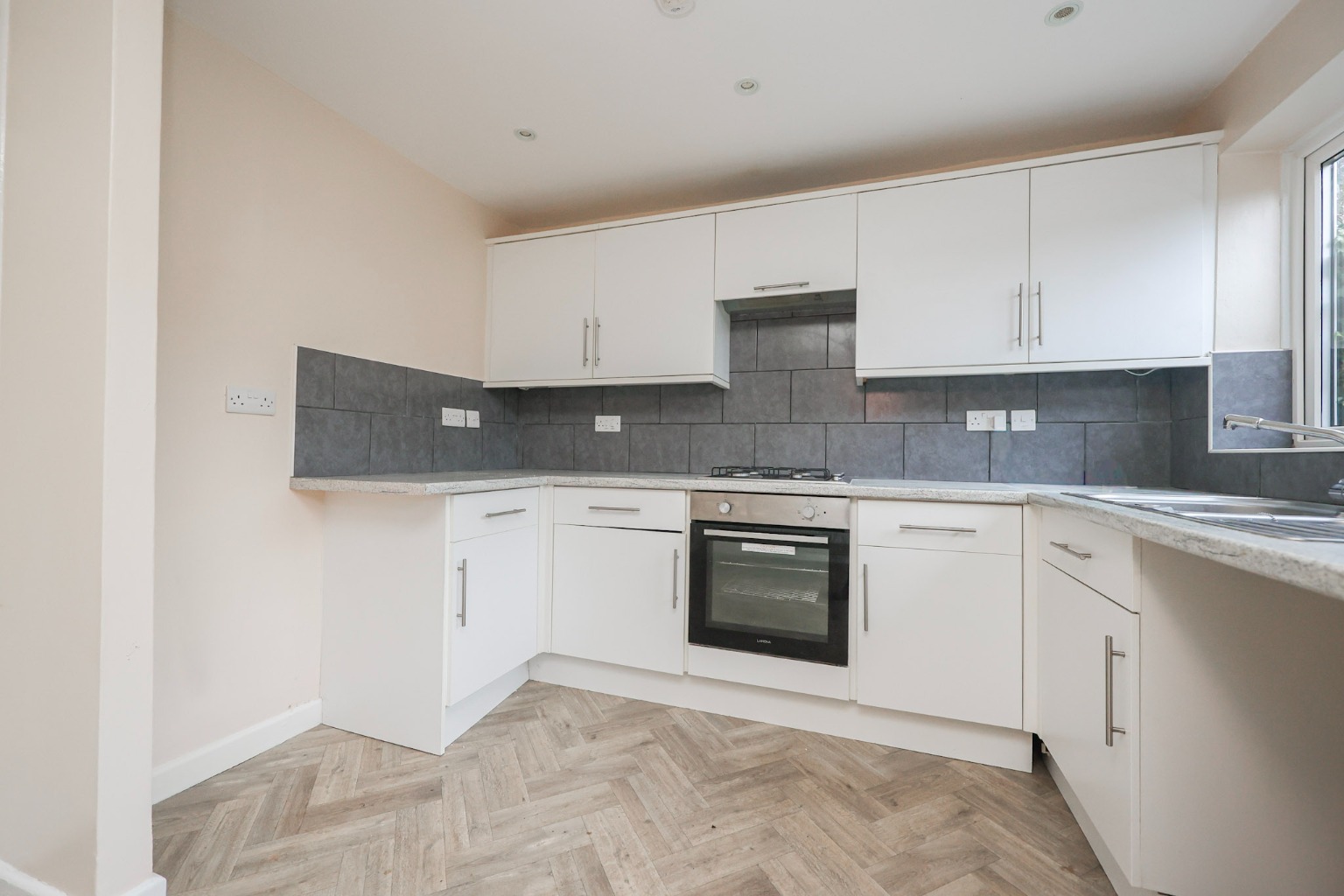 To the rear, the kitchen/dining area is fitted with a range of wall and base units, worktop space, and an inset sink with drainer. Appliances include an oven, gas hob, with space provided for a washing machine and dishwasher. The kitchen also benefits from useful storage and space for a dining table, creating a functional everyday living area.