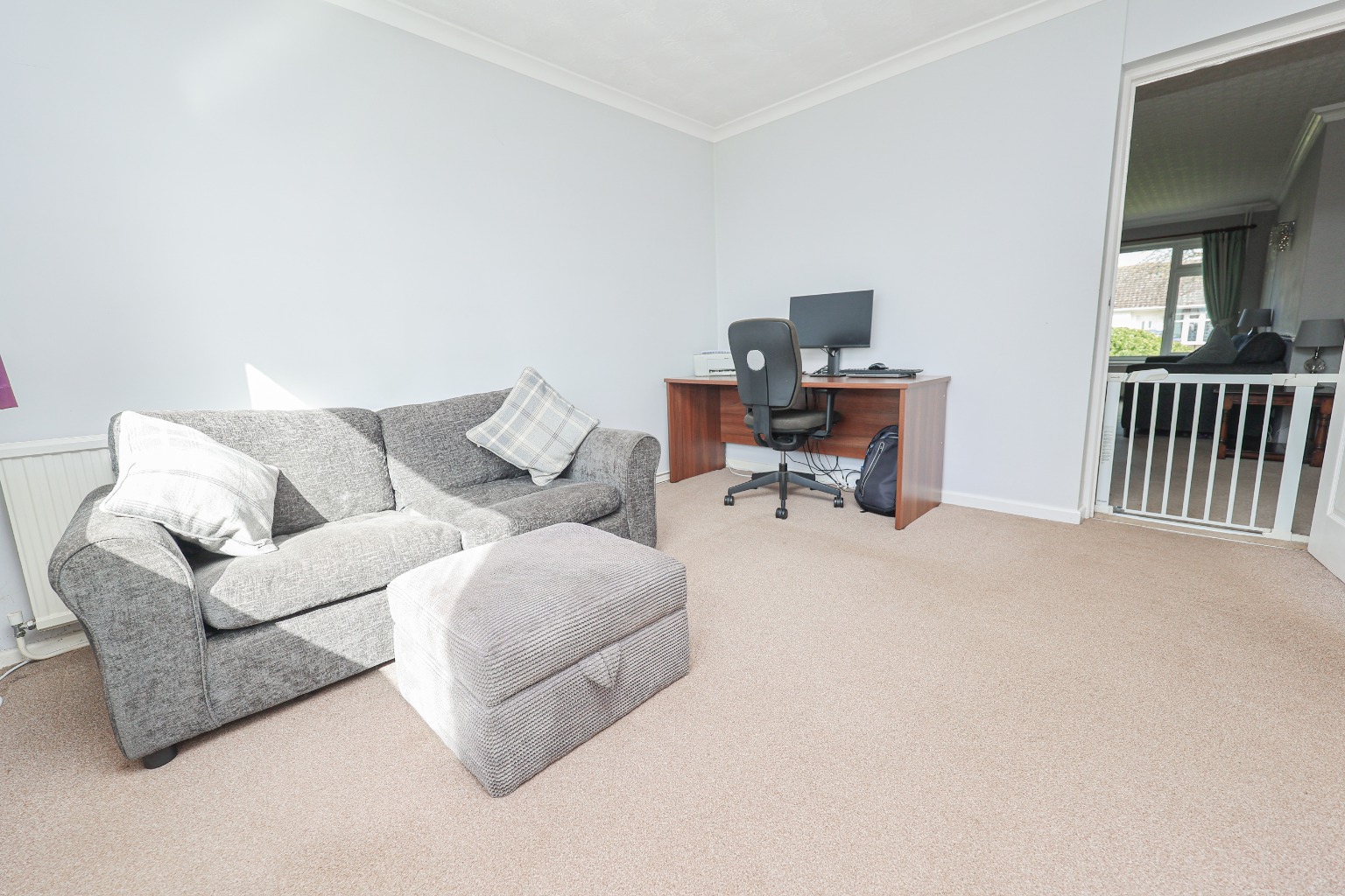 The first floor landing provides access to the loft space and includes a built-in cupboard housing the Ideal gas fired combi boiler and thermostat. Bedroom one is an exceptionally generous double room measuring approximately 5.69m x 3.35m (18'8" x 11'0"), complete with radiator, coved cornicing and telephone point. Bedroom two is another spacious double room measuring approximately 5.69m x 2.69m (18'8" x 8'10") and benefits from two radiators and coved cornicing. Bedroom three measures approximately 4.27m maximum x 3.05m (14'0" max x 10'0") and provides a further great sized double bedroom ideal for family living, guests or a home office. The family bathroom is beautifully appointed with a panelled bath, complemented by a fully plumbed-in thermostatic mixer mains-pressure overhead shower. There is also a low-level WC, pedestal wash basin, radiator, and fully tiled walls and floor, creating a stylish yet practical space for everyday family living.