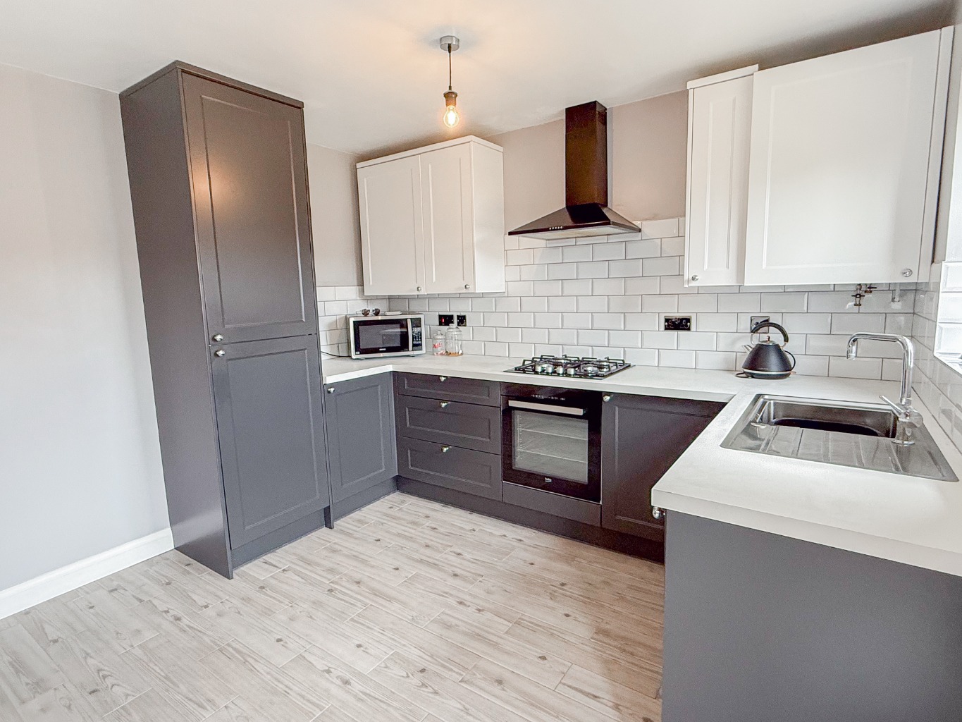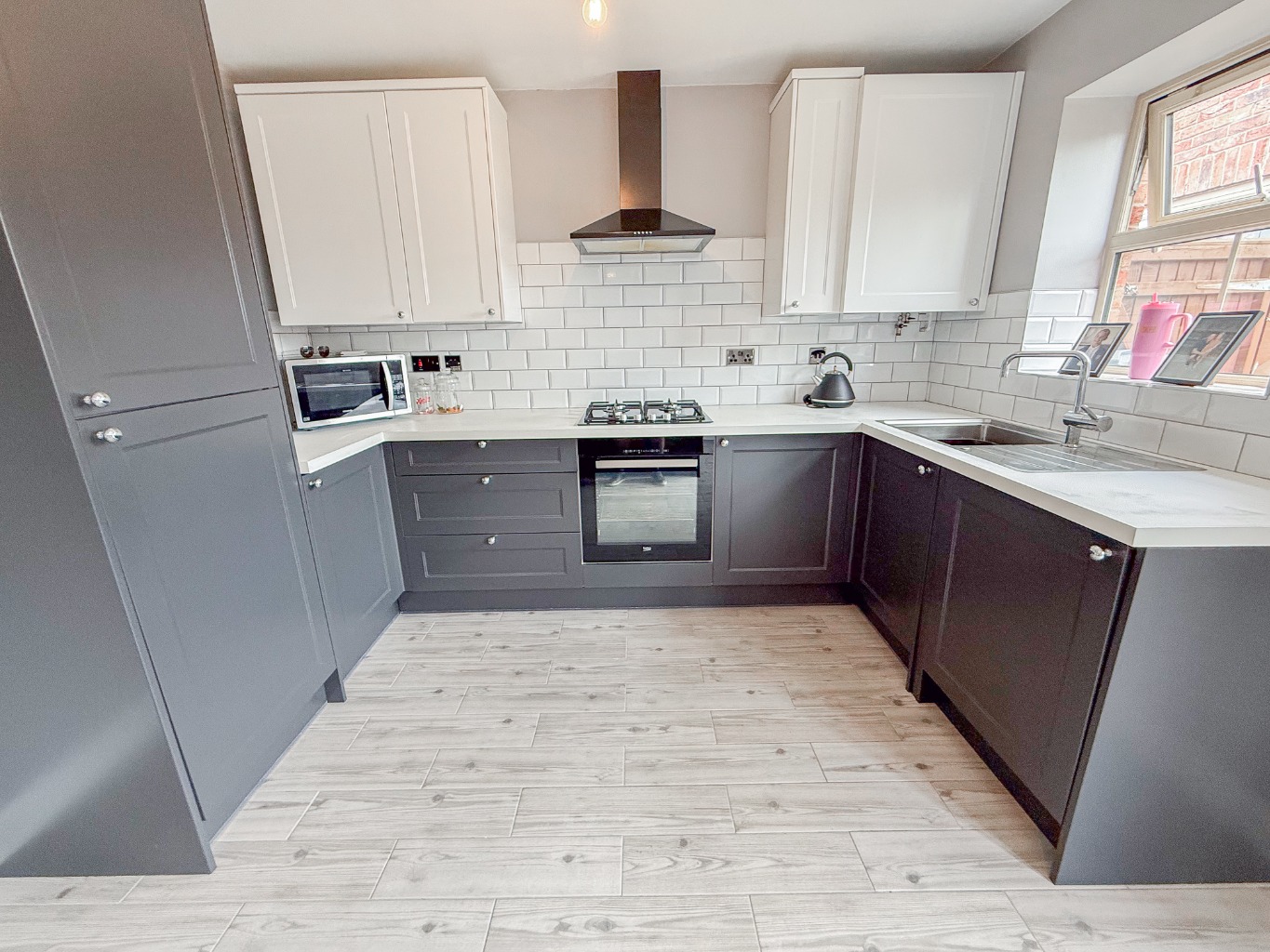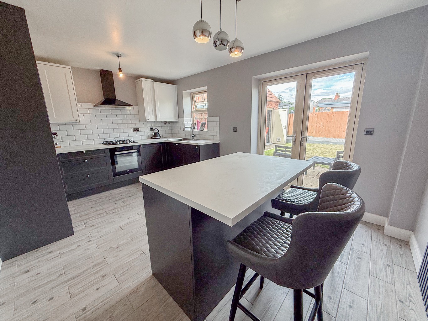 At the rear of the home lies the Kitchen Diner (4.70 × 3.30 m / 15'5″ × 10'10″), a real heart-of-the-home setting. This space has been finished to an excellent standard with a two-tone grey and white shaker-style kitchen, white worktops, and striking metro tile splashbacks. A central island offers breakfast seating and additional prep space, while French doors lead directly to the garden—creating a seamless flow for indoor-outdoor living.