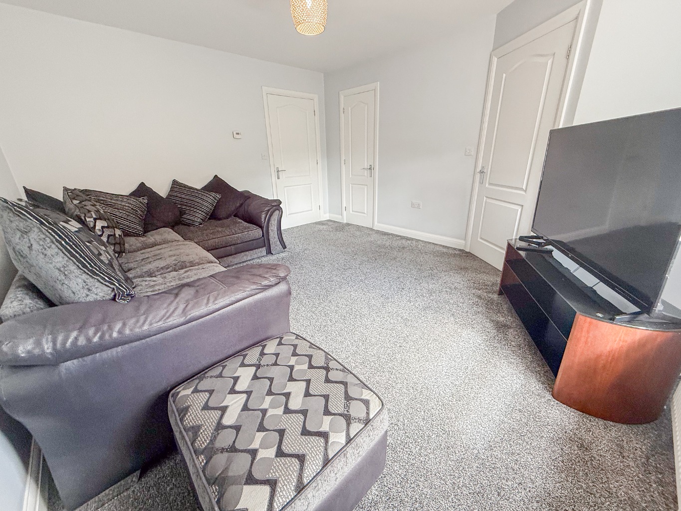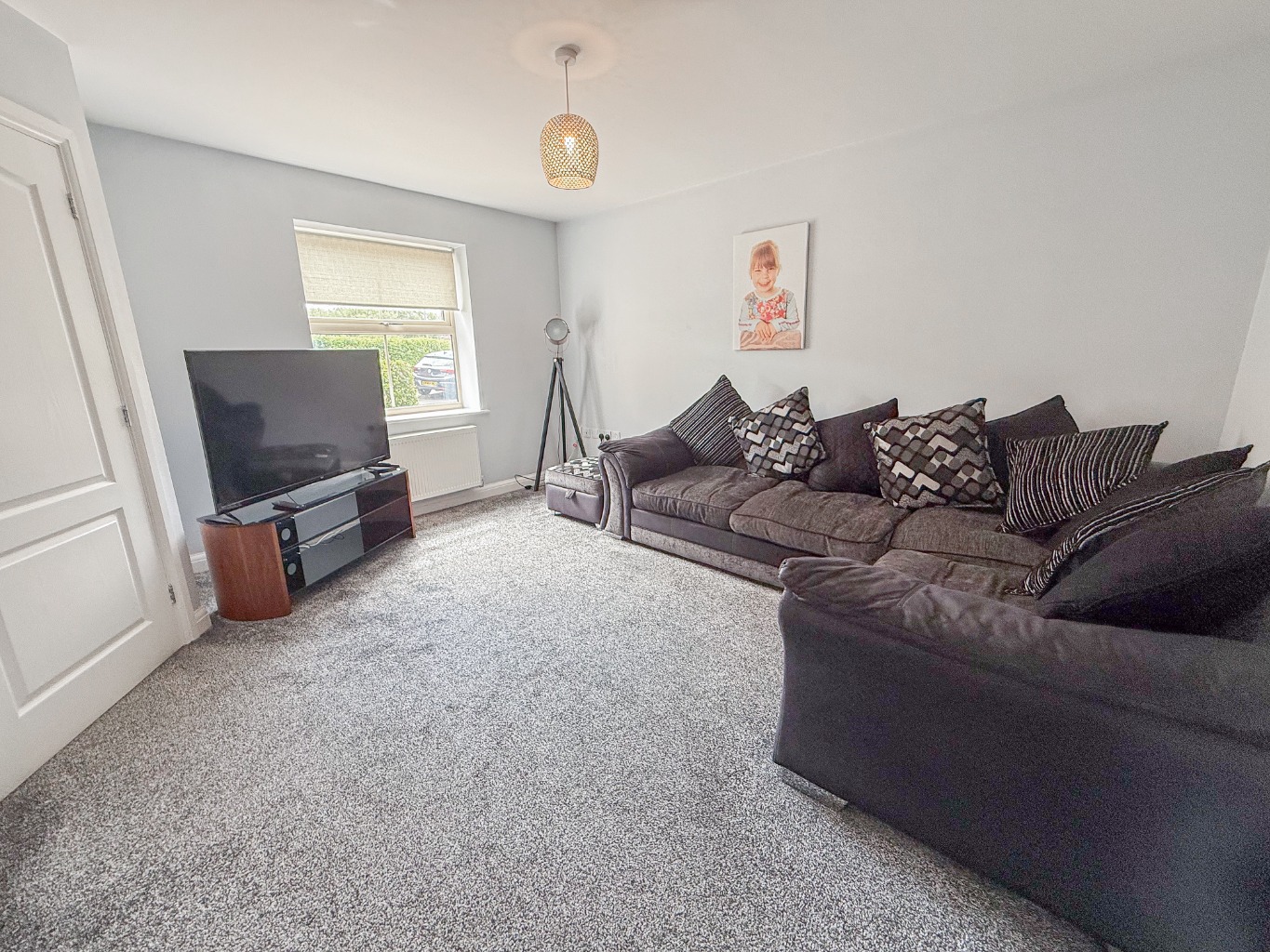 To your left, enter the well-proportioned Lounge (4.31 × 3.72 m / 14'2″ × 12'2″), a relaxing family space with plush carpet underfoot and plenty of room for seating and media. With two storage cupboards and views to the front, it’s a cosy, practical room designed for unwinding.