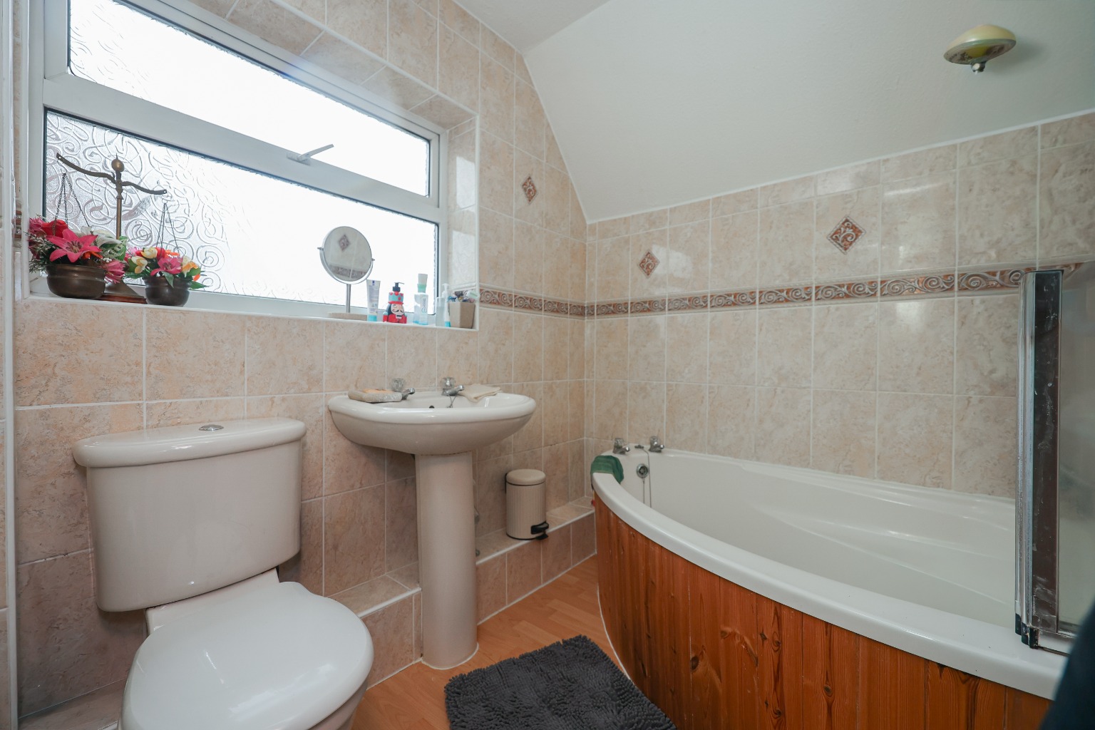 The family bathroom is fitted with a modern suite comprising a panelled bath with shower over, wash basin, WC, and tiling to splashback areas, providing a practical and easy-to-maintain space.