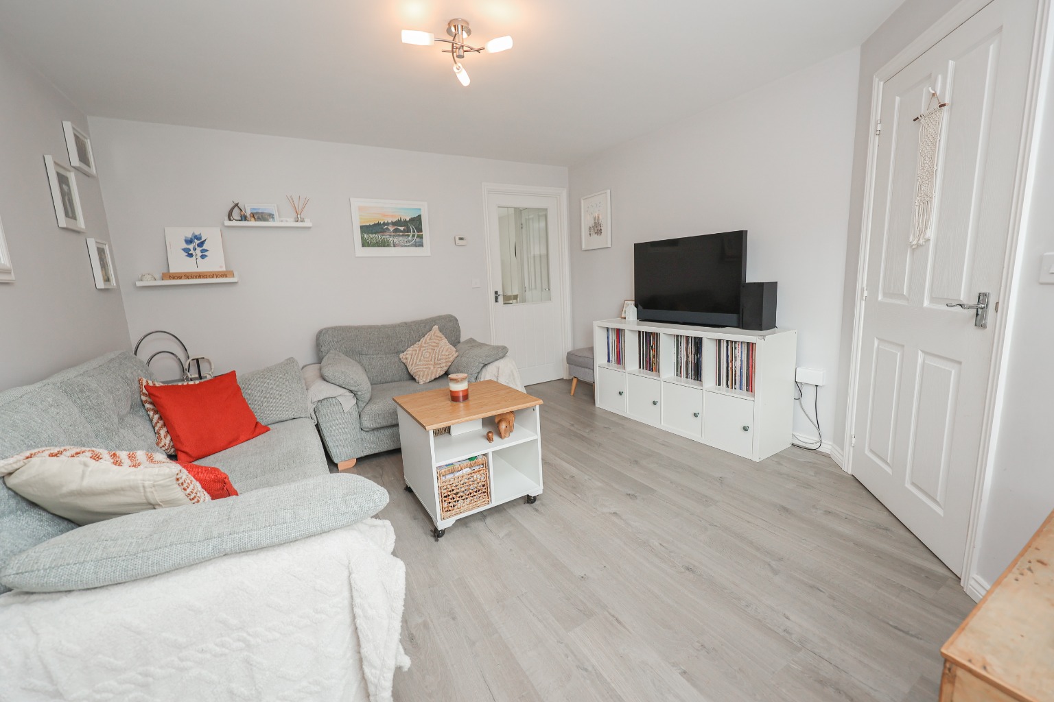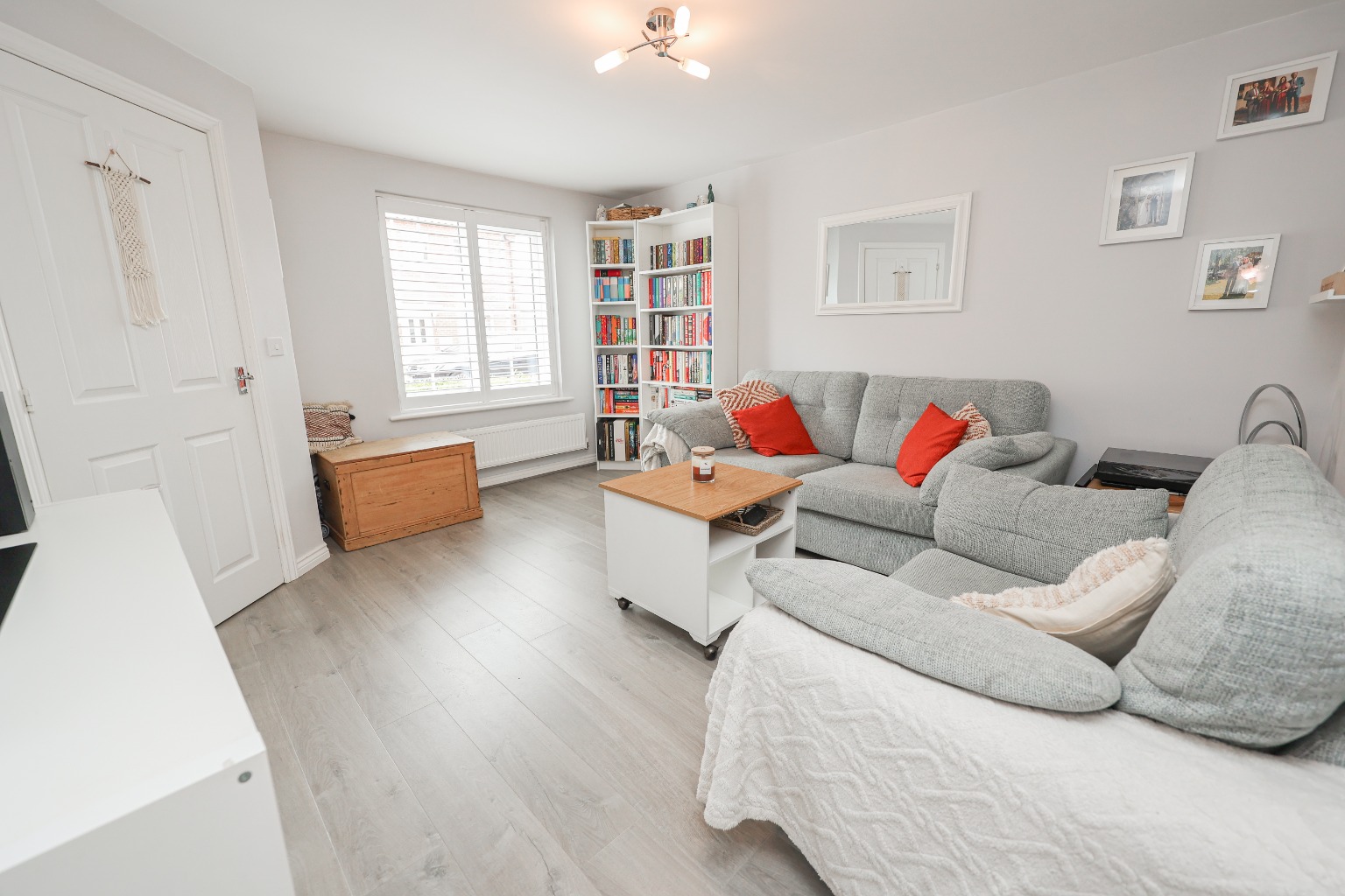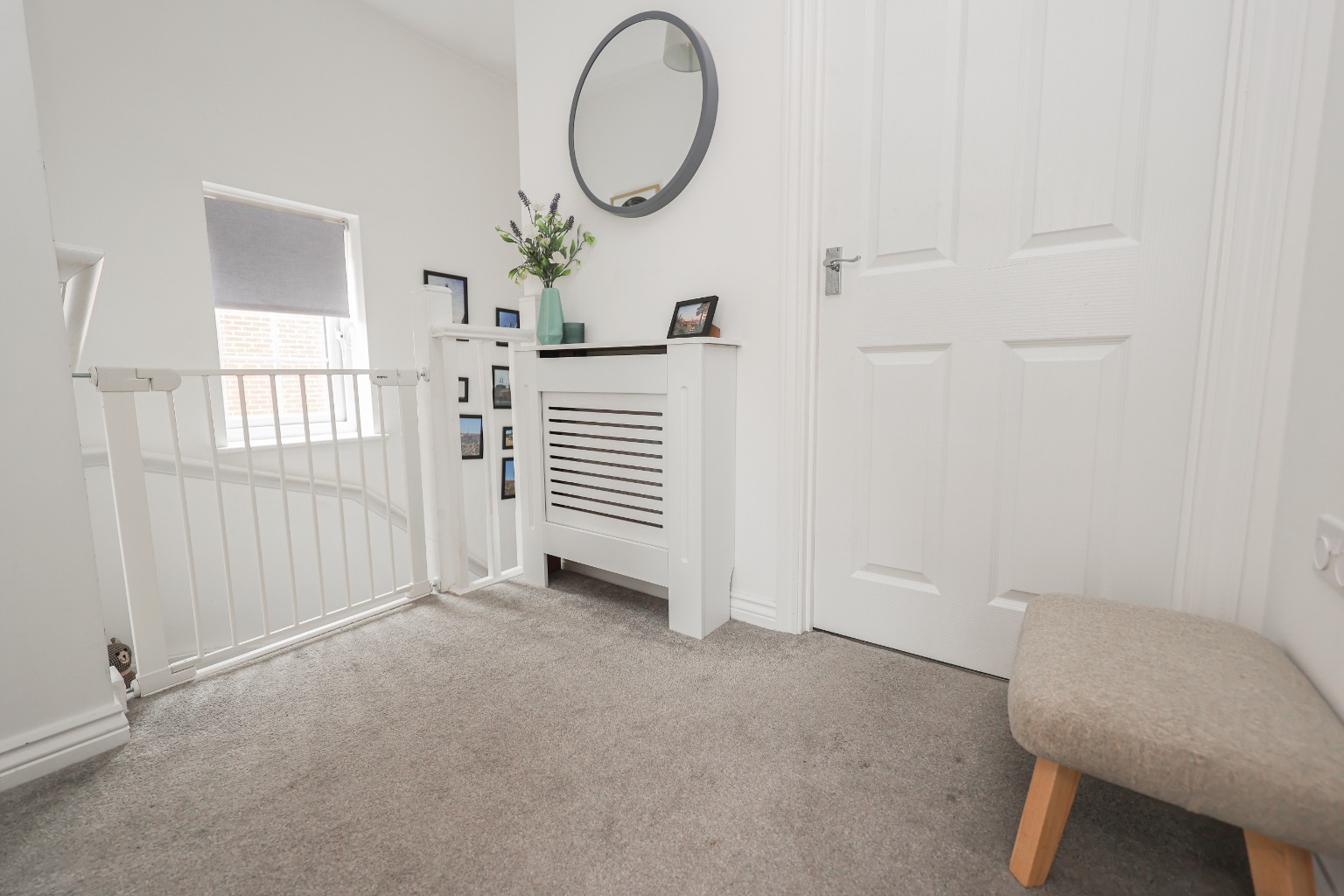 Arriving at Memorial Gardens, you’re welcomed by a neat driveway and pathway leading to the front door. Step inside into a bright Entrance Hallway, with modern laminate flooring underfoot, a wall-mounted radiator, and stairs rising to the first floor.