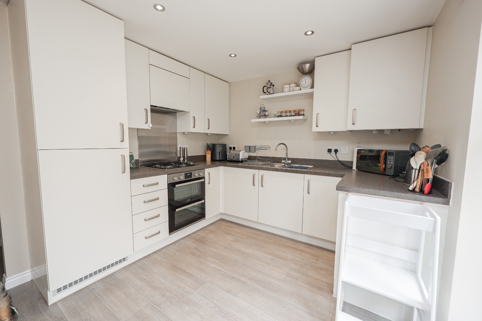 To the left is the Lounge (4.24m x 3.69m / 13′11″ x 12′1″), a lovely reception space featuring laminate flooring, a radiator, and a window to the front complete with stylish fitted wooden shutters — a perfect spot for relaxing after a busy day. Before you reach the kitchen, there’s a handy Downstairs WC (1.02m x 1.85m / 3′4″ x 6′1″), fitted with toilet, hand basin, tiled splashback, radiator and extractor fan — ideal for guests or family convenience. At the heart of the home sits the impressive Kitchen Diner (4.72m x 3.99m / 15′6″ x 13′1″). This modern, light-filled space boasts matching wall and base units, a full range of integrated appliances including dishwasher, washing machine, fridge freezer, and a double oven with gas hob and extractor. The stylish stainless steel 1½ bowl sink sits below a rear-facing window, and French doors open directly onto the rear garden, blending indoor and outdoor living beautifully. An understairs storage cupboard adds extra practicality.
