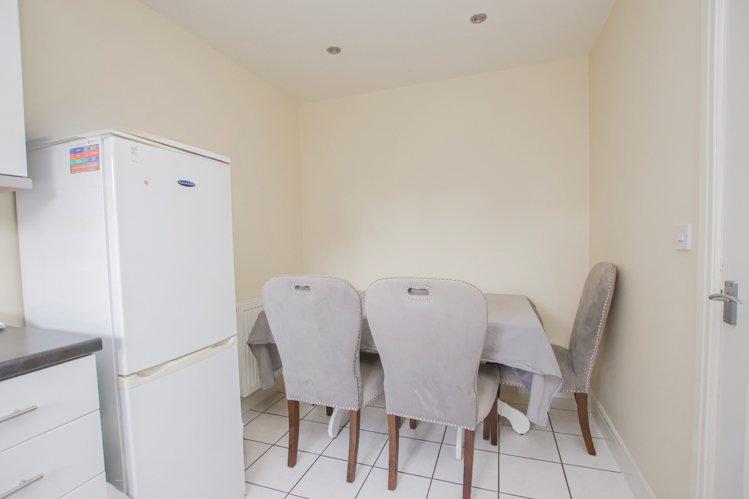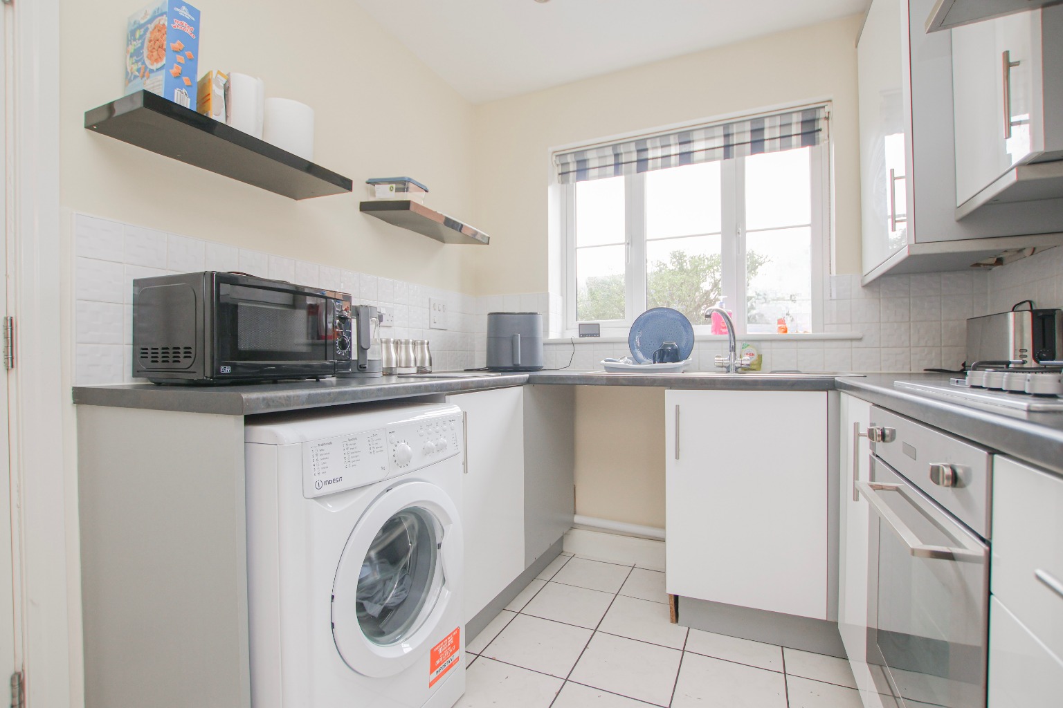 The kitchen sits to the front of the property and measures approximately 4.22m x 2.24m (13'10" x 7'4"). Fitted with tiled flooring, wall and base units and tiled splashbacks, the kitchen provides a practical and stylish space for everyday use. There is an oven, four-ring gas hob with extractor above, space for a fridge freezer, dishwasher and washing machine, with a front-facing window overlooking the attractive greenery outside.