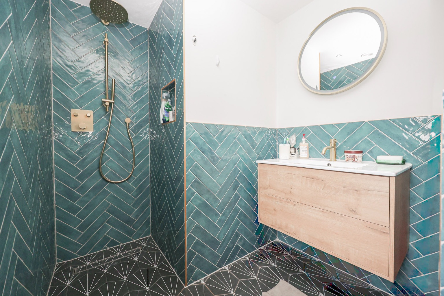 The family bathroom (approx. 1.70m x 3.90m) has been recently refurbished and is fitted with a modern wet-room style shower, WC, wash basin, tiled flooring and walls, and frosted front-facing window.