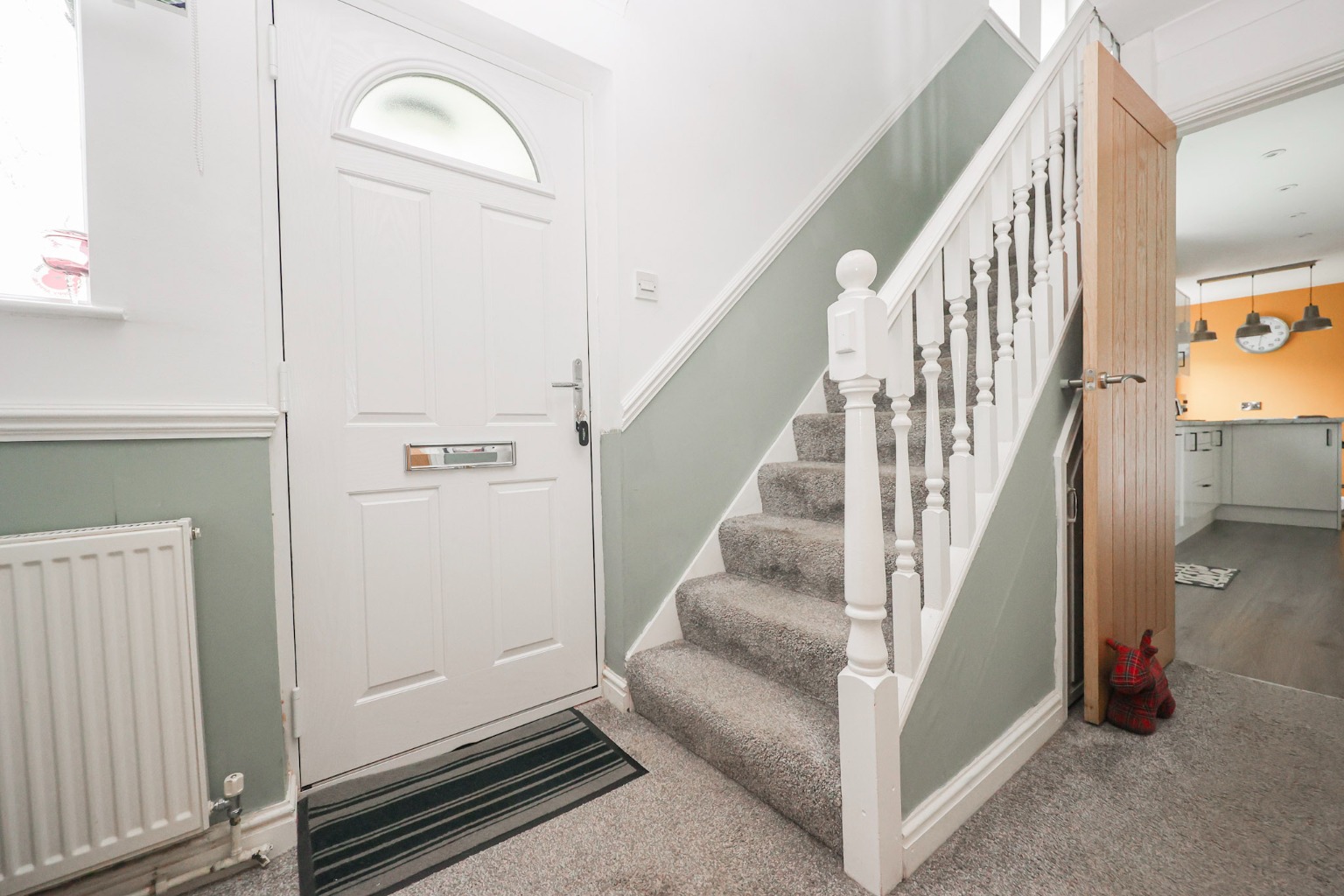 The property is accessed via a uPVC front door into a welcoming entrance hallway (approx. 3.40m x 1.70m), which benefits from built-in storage and provides access to the main ground floor accommodation. Stairs rise to the first floor, and the hallway is finished with carpeted flooring.