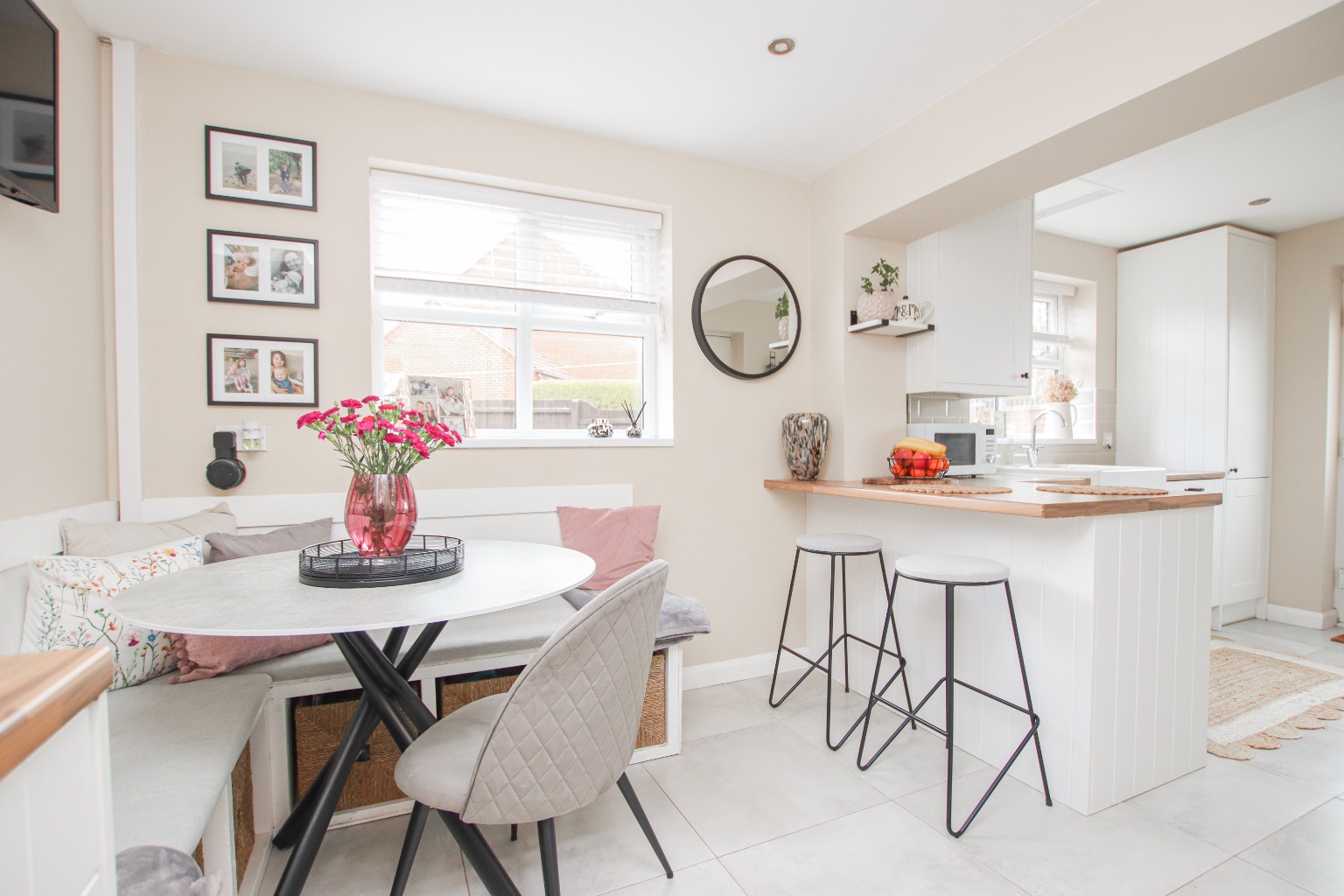 Continuing through the hallway, the property opens into the kitchen and dining room (3.60m x 3.40m). The dining space offers excellent storage and even features a built-in corner bench, making it a great place for family meals. Tiled flooring continues through into the kitchen area.