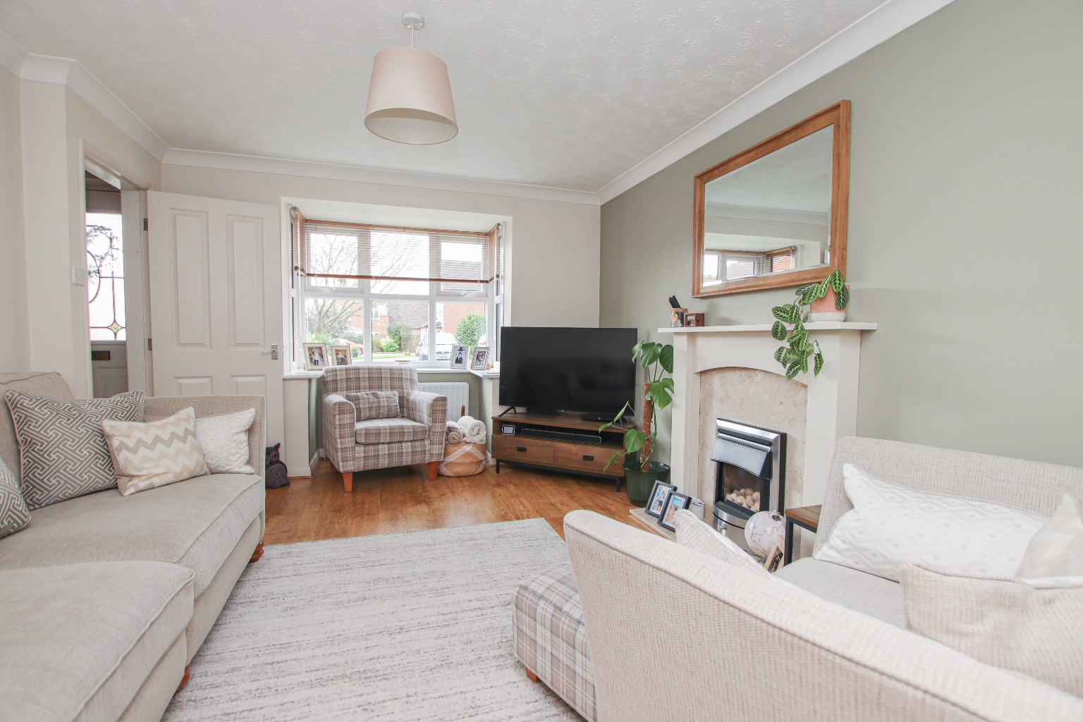 To the left of the hallway is the main living room, a comfortable and inviting reception space featuring wooden flooring, a beautiful bay window to the front aspect and an electric fireplace creating a cosy focal point.