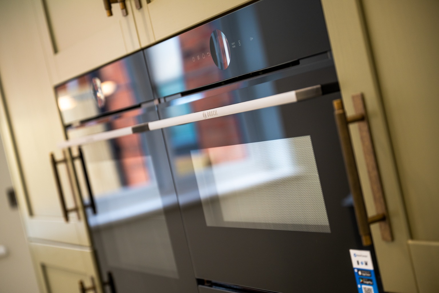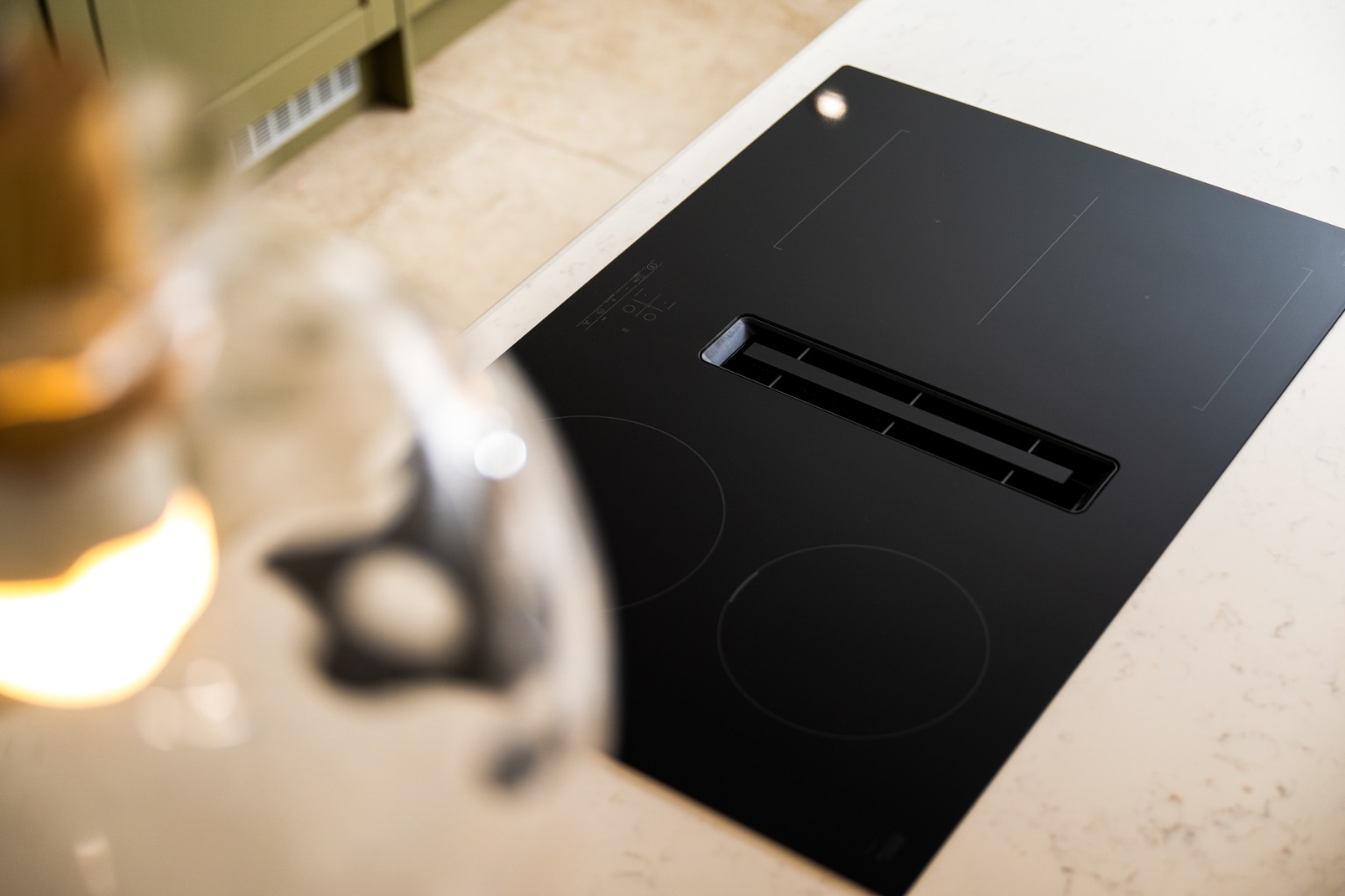 State-of-the-art Bosch appliances including down-venting hob, wine cooler, oven, and combination microwave