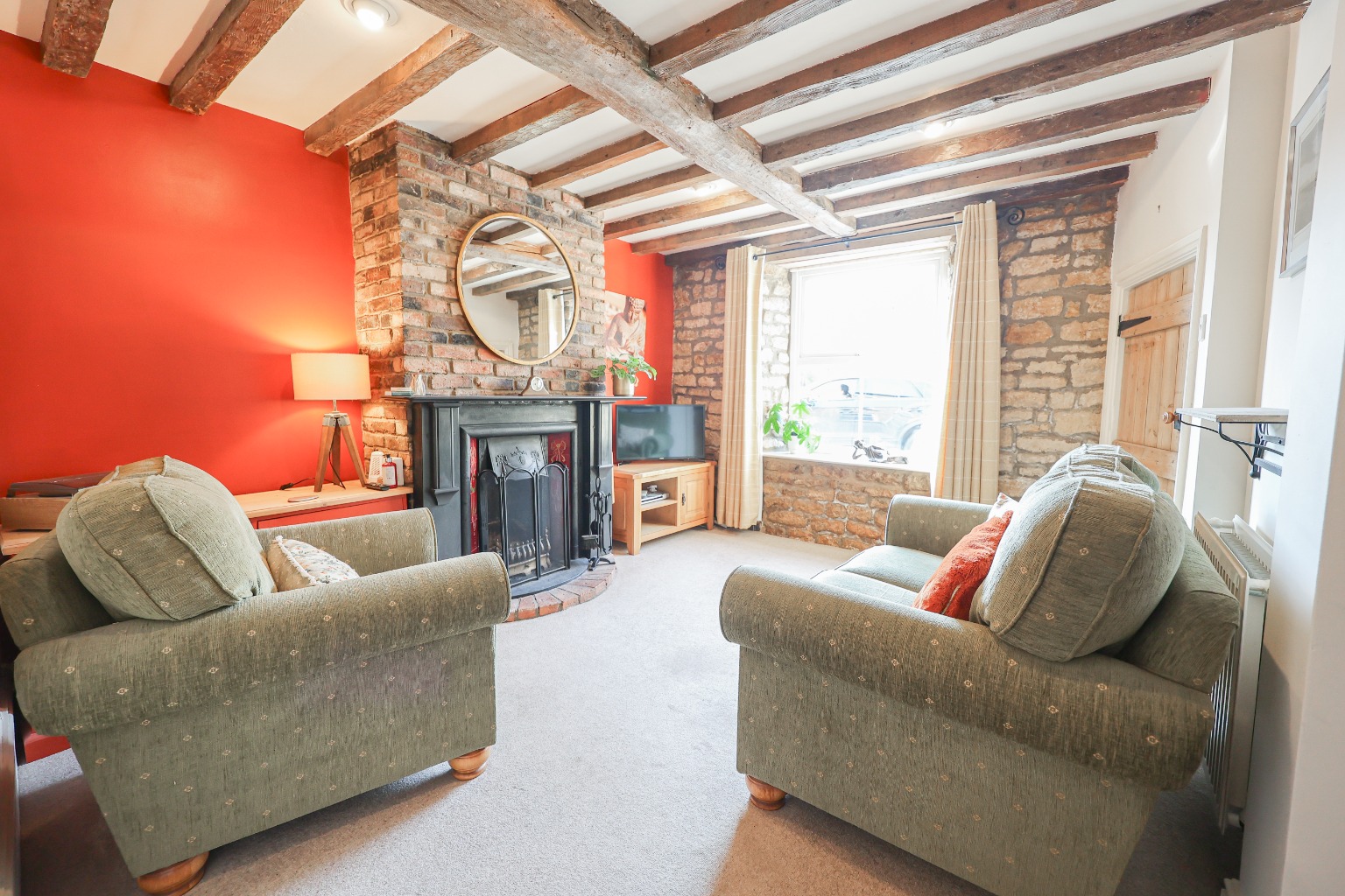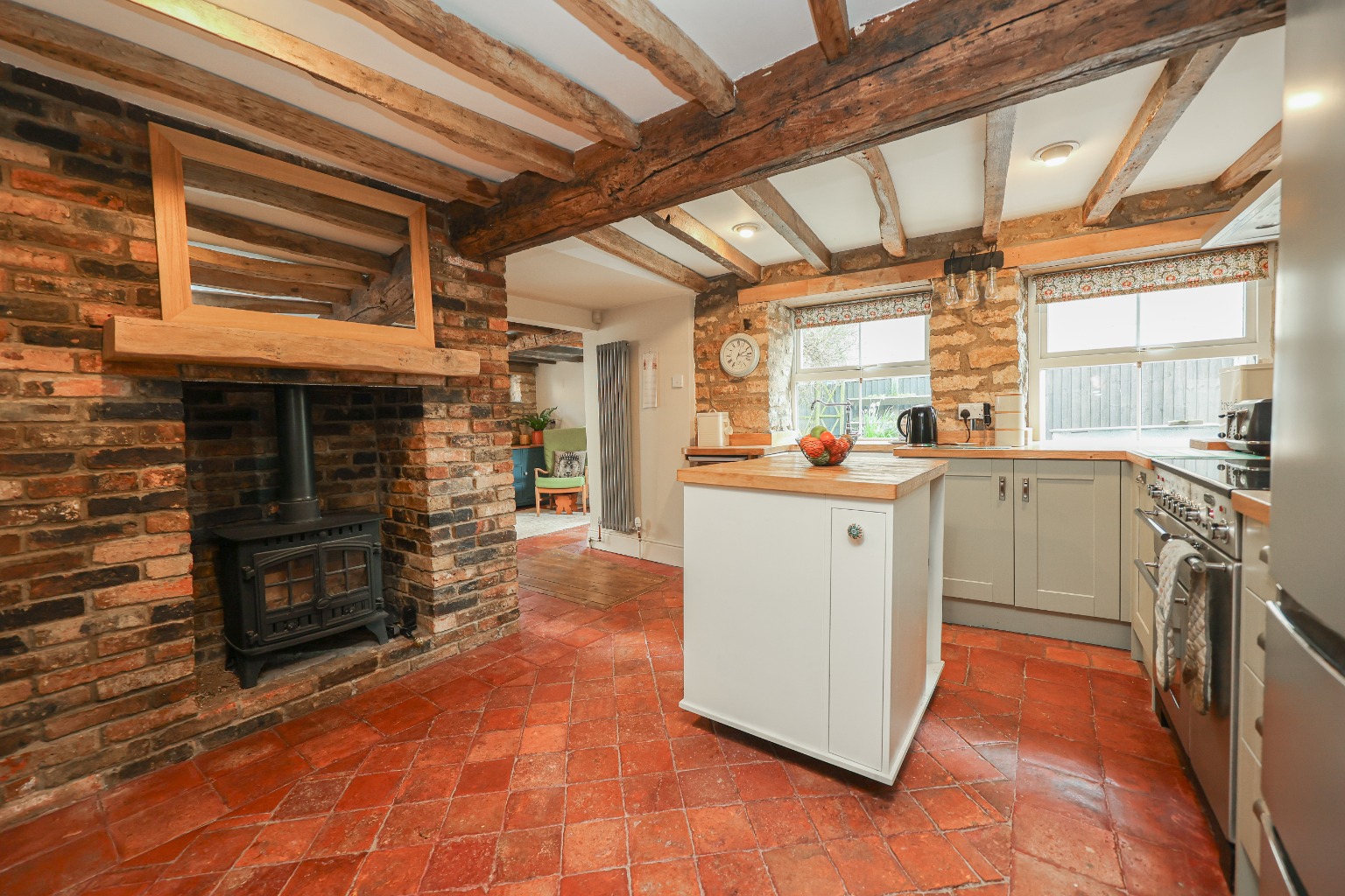From the moment you enter, the home’s character and warmth are immediately apparent. The entrance hall leads through to a cosy sitting room (3.43m x 3.86m), centred around a traditional open fireplace, creating the perfect space to unwind. To the front of the property, a versatile additional reception room (3.40m x 3.81m) offers flexibility as a fourth bedroom, home office or snug, depending on your needs. The heart of the home is the kitchen (3.83m x 4.11m), installed approximately 2/3 years ago, which combines traditional styling with modern convenience. Featuring a Belfast sink, a range of quality units, original quarry tiled flooring and a wood-burning stove, this space perfectly reflects the cottage’s heritage. Leading on, the breakfast room (3.78m x 2.94m) provides a wonderful transitional space, with French doors opening onto the garden and access down to a useful cellar. The property then opens into the truly spectacular barn conversion (8.15m x 3.22m) – a stunning reception area with vaulted ceilings, exposed beams, skylights and a feature apex window. With underfloor heating and bifold doors connecting seamlessly to the garden, this space is ideal for entertaining or modern open-plan living. The ground floor is further complemented by a utility area suitable for washing machine and tumble dryer, and a convenient WC.