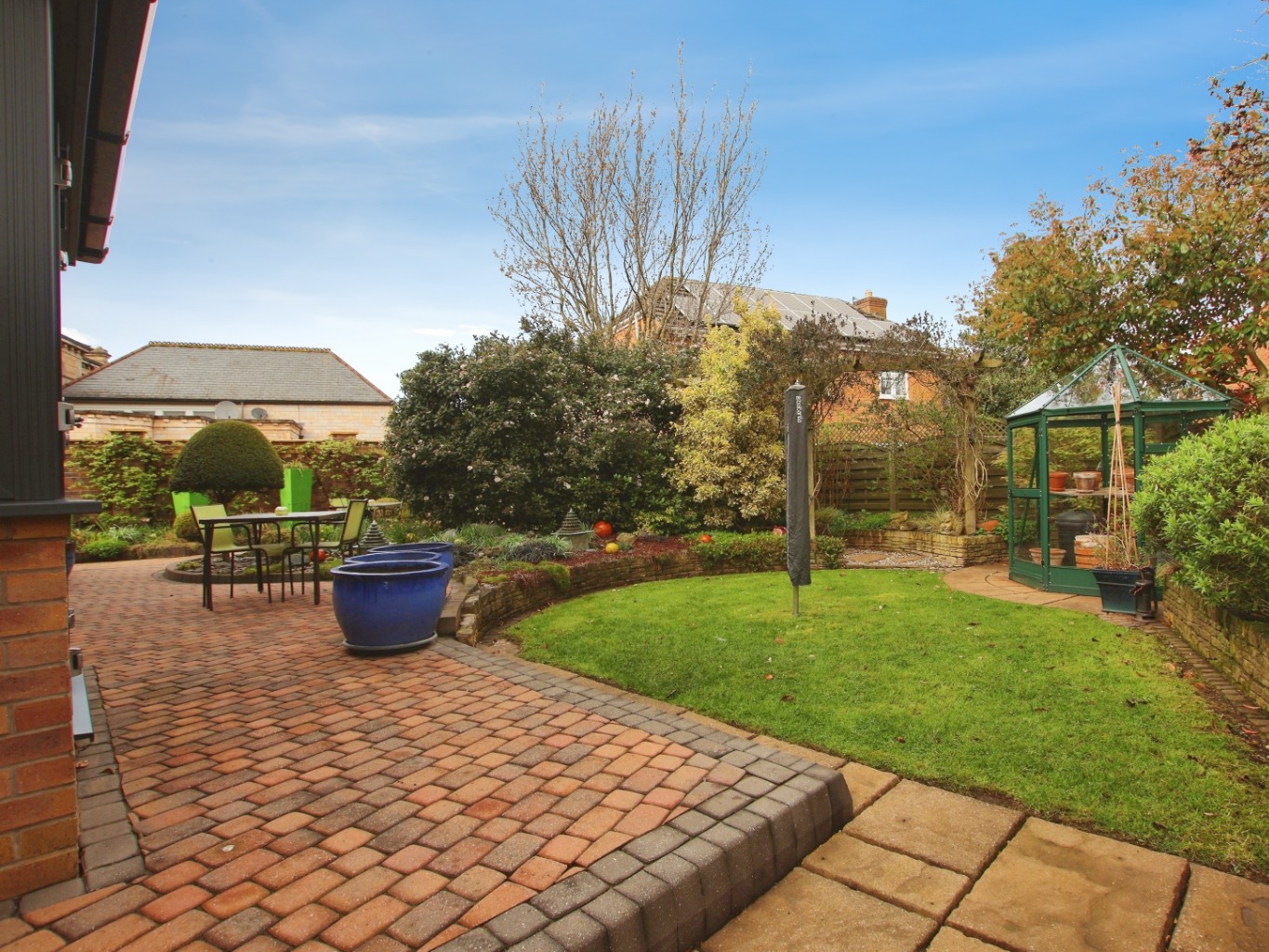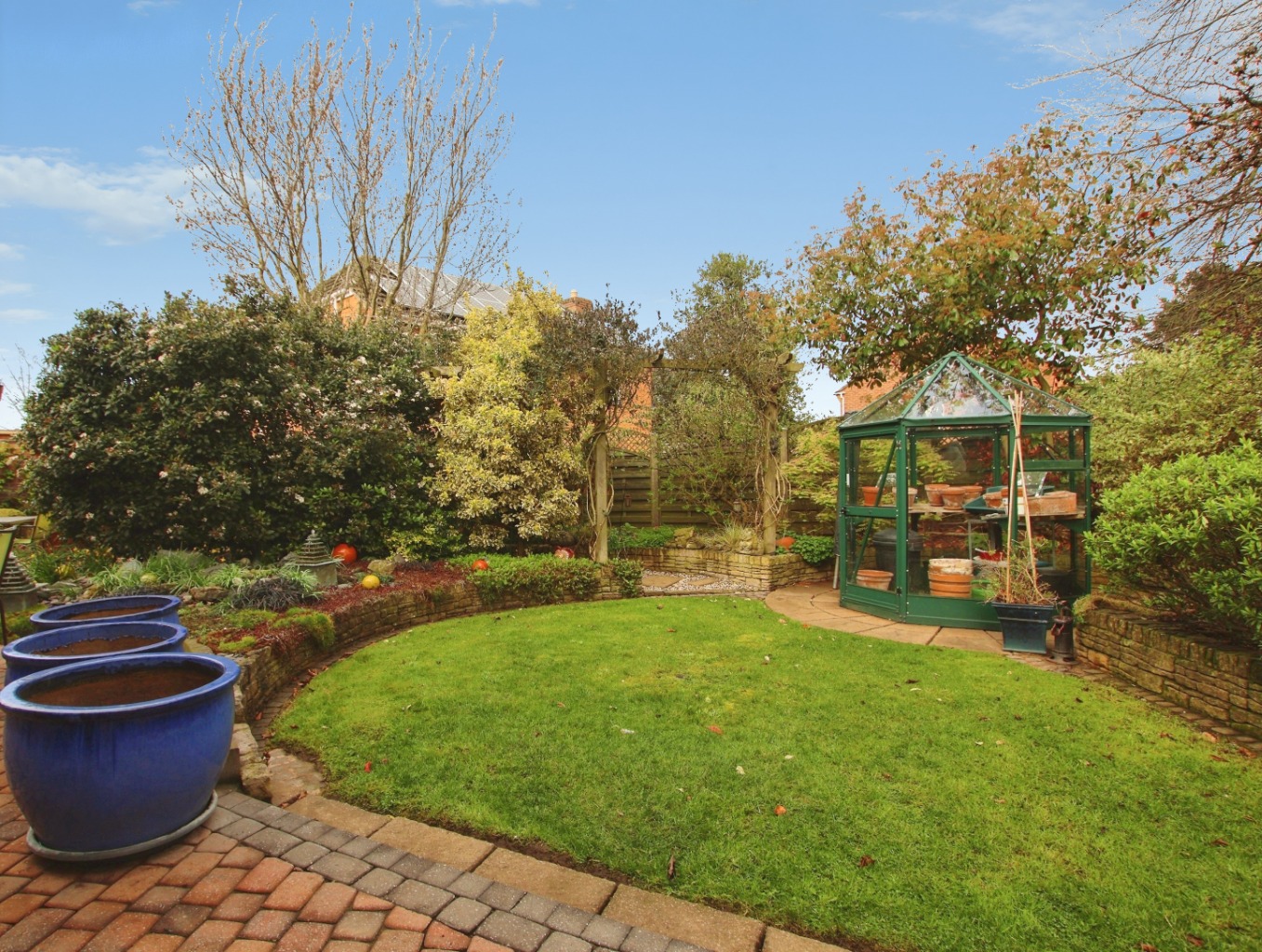 Outside, the property enjoys an impressive frontage with a large permeable block paved driveway providing parking for upto 5 vehicles, along with access to the double integral garage with roller doors. The rear garden is equally impressive, featuring a lawned garden area, three separate patio seating areas, a garden house and a green shed, creating an excellent outdoor space for entertaining, relaxing and family life.