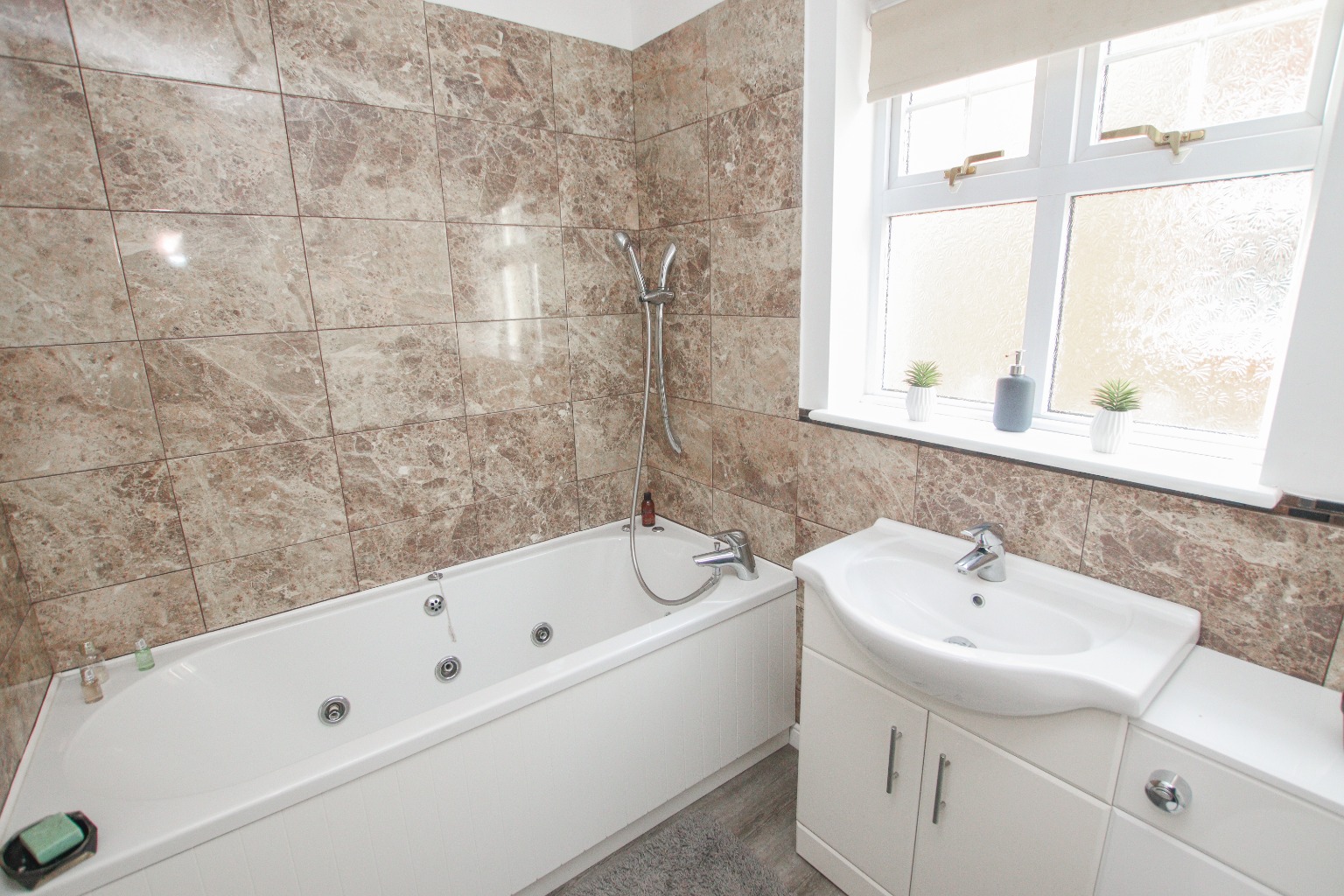 The Family Bathroom includes a Jacuzzi-style bath with tiled surround, wash basin, WC, radiator, extractor fan and a frosted side-aspect window, finished with wooden LVT flooring.