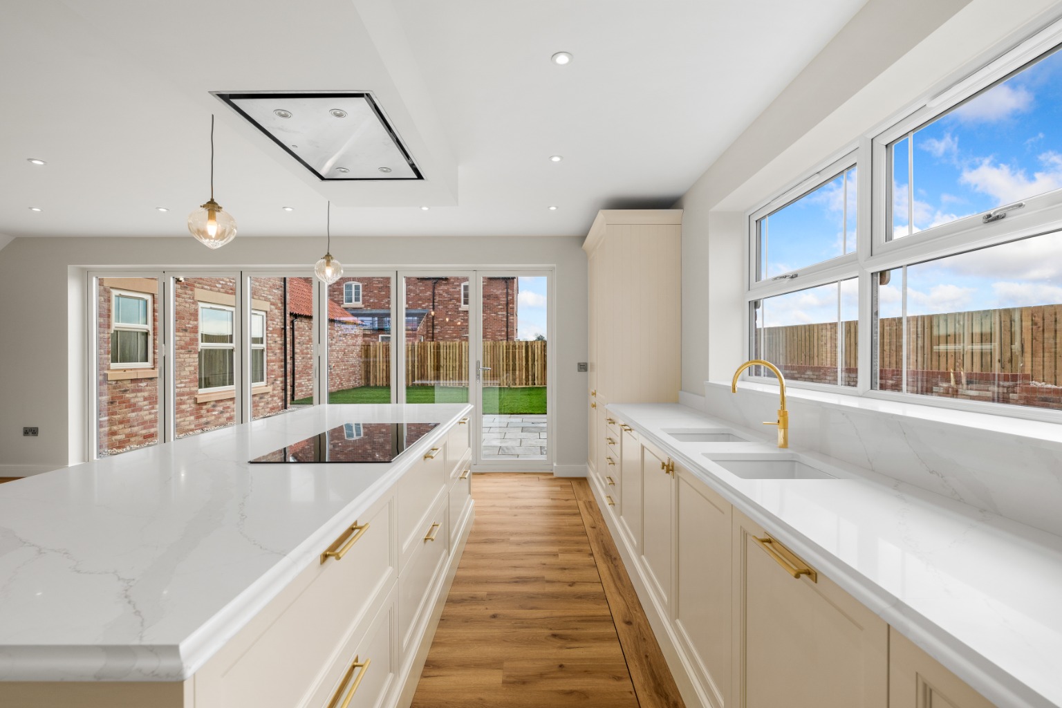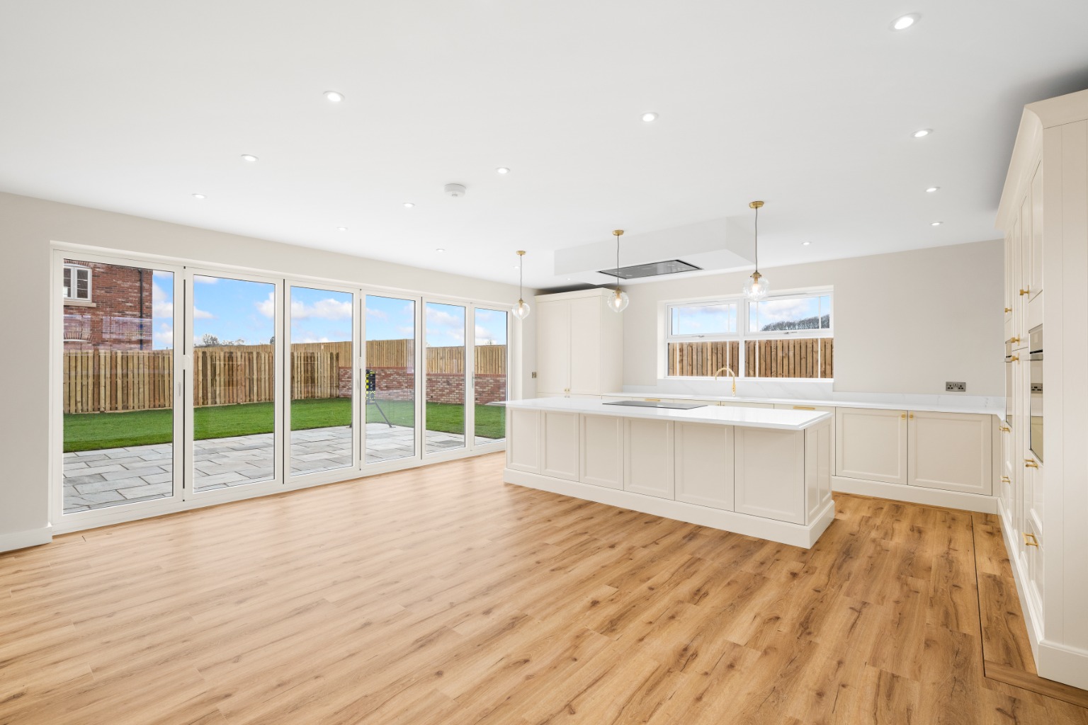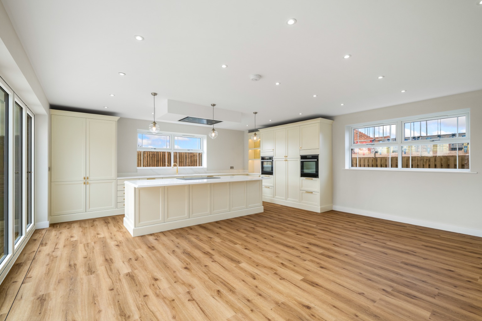 - Kitchen / Living Room – 7.55m x 6.02m The true heart of the home — a breathtaking open-plan kitchen, orangery, and living space featuring two sets of aluminium anthracite bi-folding doors opening onto the rear patio and garden. • Quartz worktops and undermounted stainless-steel sink • Neff/Bosch Group integrated appliances including full-size oven, combi-microwave, plate warmer, induction hob, extractor, dishwasher, and wine cooler • Full-height fridge and freezer (in larger plots) • Under-cabinet lighting and LED spotlights • 20mm quartz splashbacks (upgrade available) • Designed and supplied by AMCO Kitchens of South Yorkshire, offering a 20-year guarantee on cabinets and a 15-year guarantee on doors and accessories