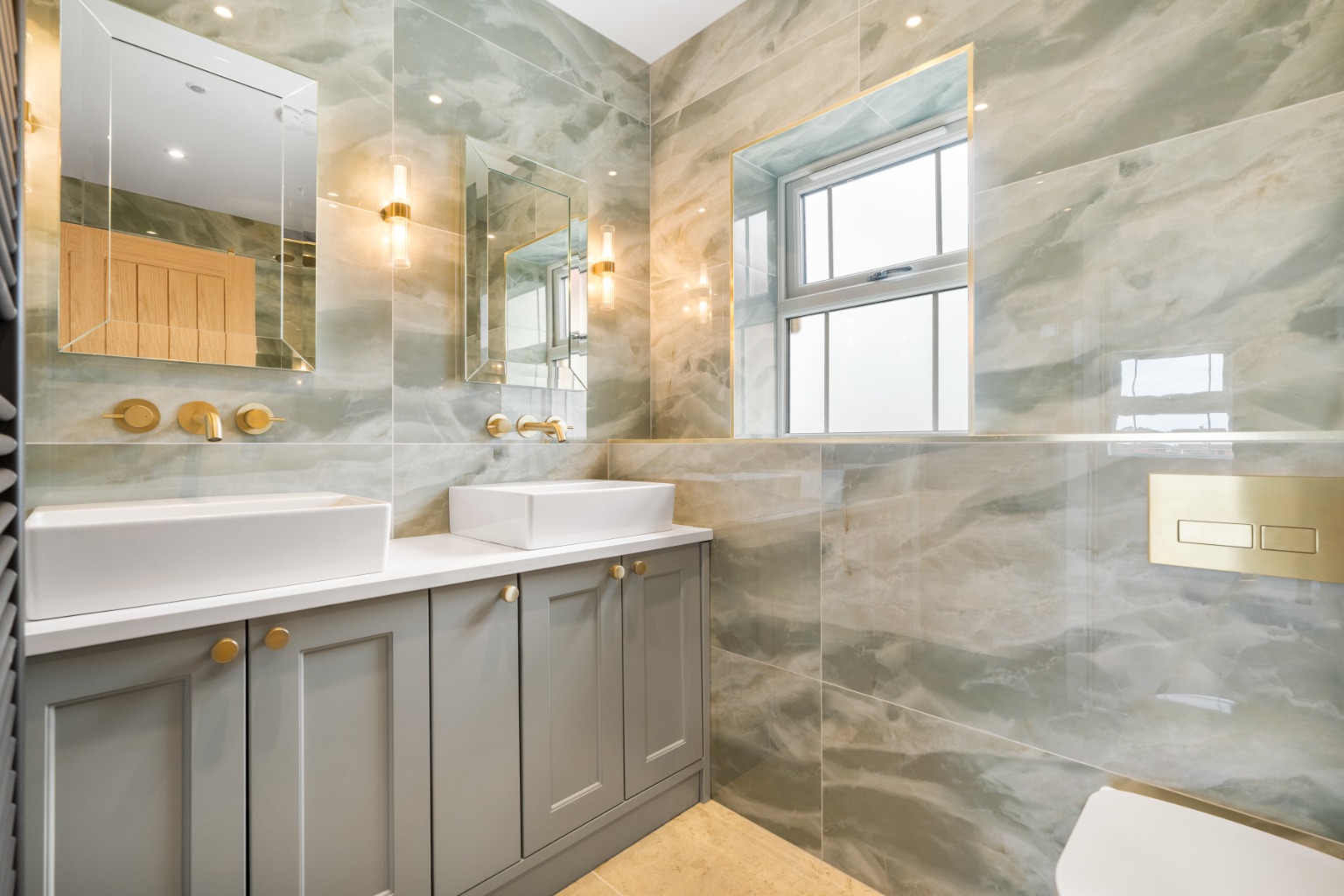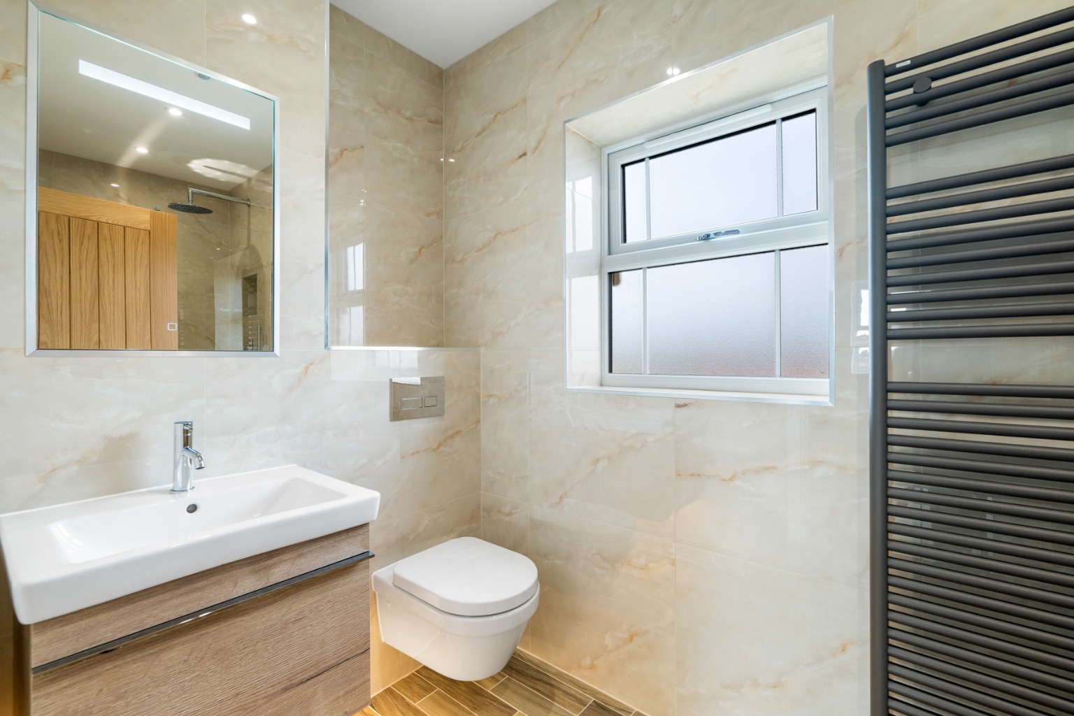 - Ensuite to Bedroom One Fully tiled, with walk-in rainfall shower, Villeroy & Boch vanity unit, concealed cistern toilet, LED illuminated mirror cabinet, and chrome brassware (upgradeable to matt black).