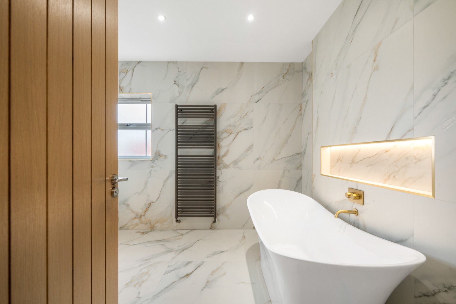 - Family Bathroom A fully tiled, contemporary space featuring a separate walk-in shower, freestanding bath, Villeroy & Boch concealed cistern toilet, and wall-mounted vanity unit with integrated storage.