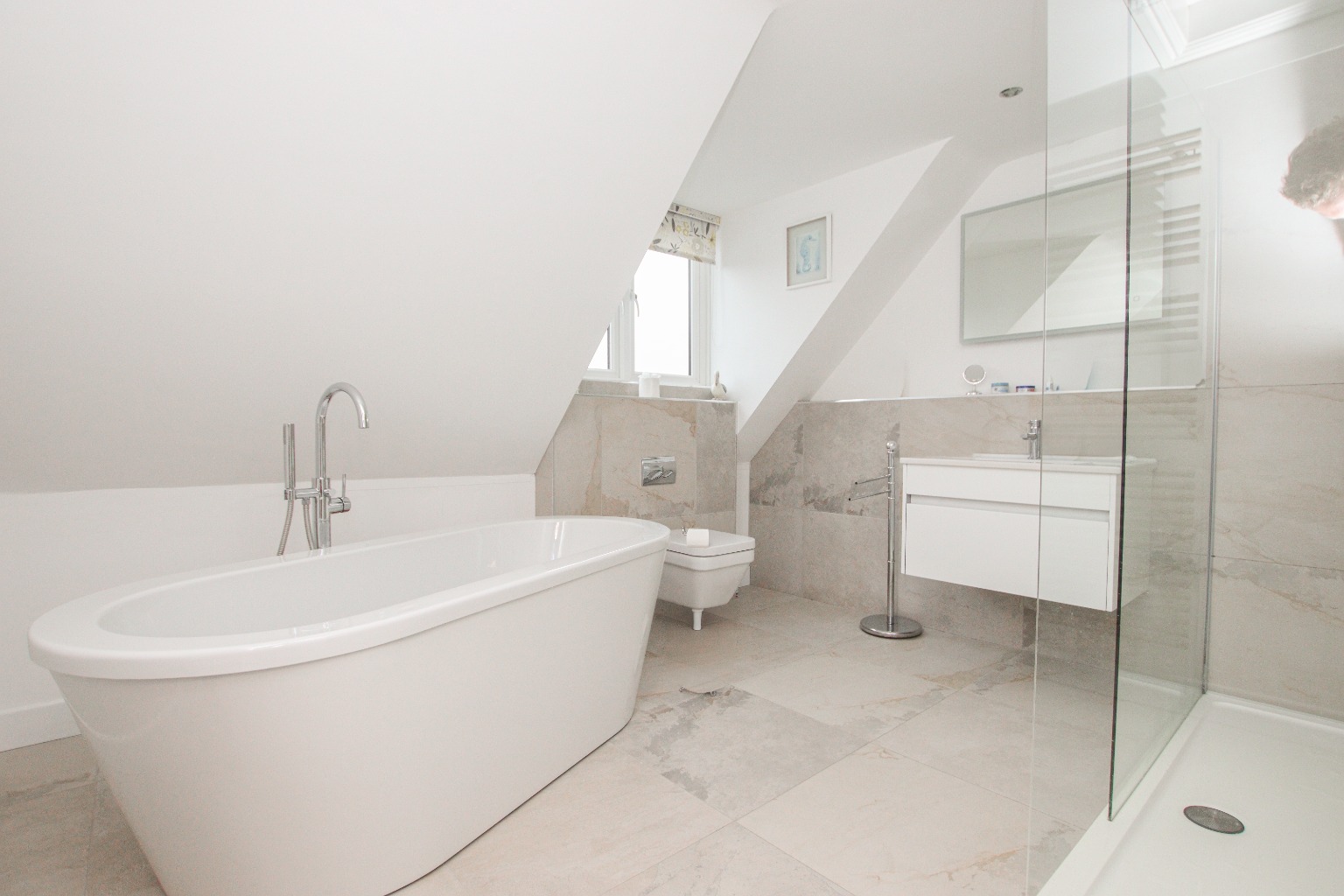 The main shower room is fitted with a modern three-piece suite including cubicle shower enclosure, vanity basin, WC, heated towel rail and Velux window.