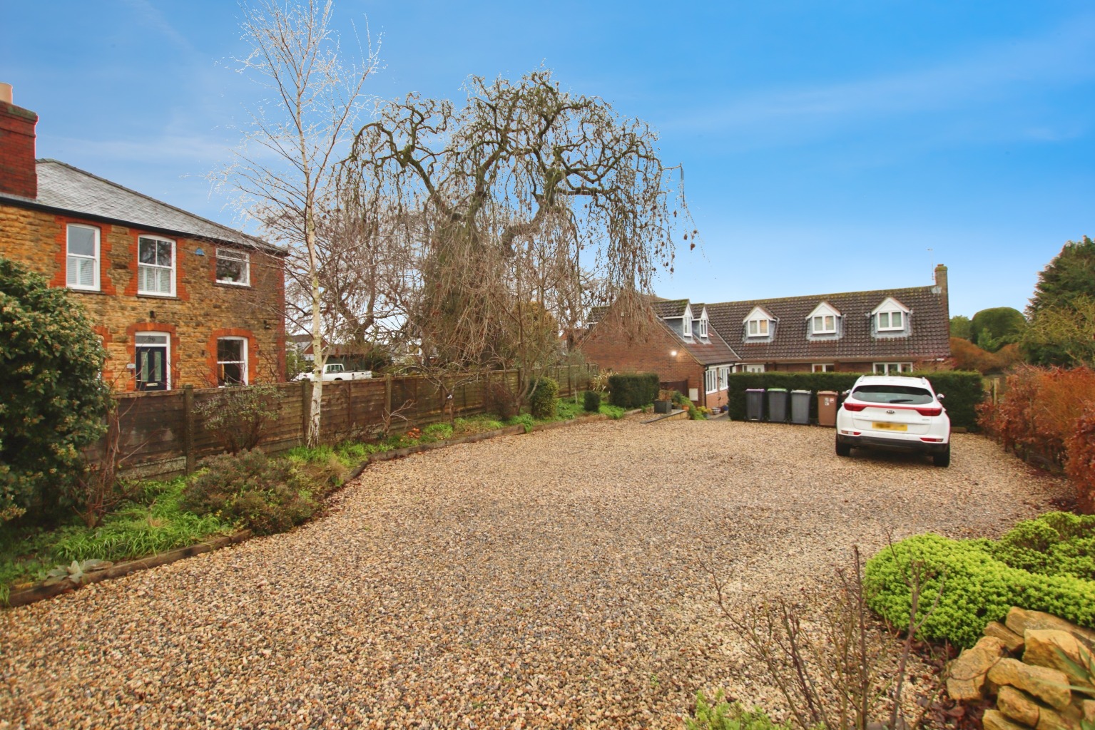 The property occupies an impressive plot with gardens to the front, side and rear, alongside a substantial gravel driveway providing ample off-road parking for multiple vehicles.
