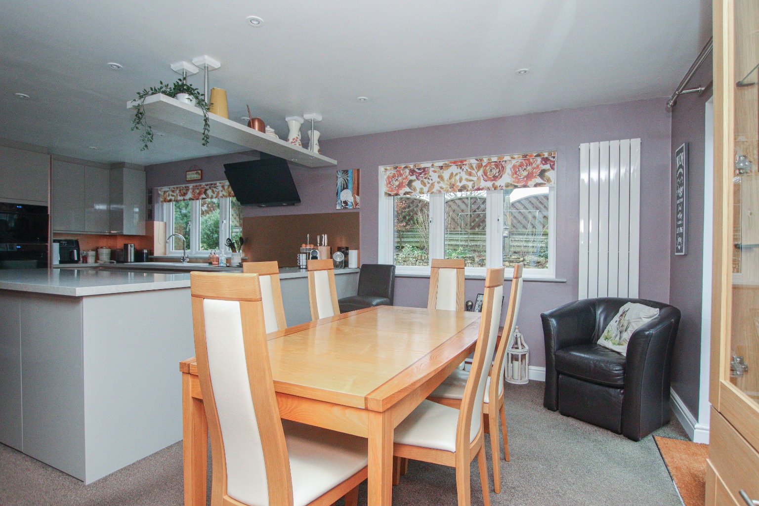 The heart of the home is the impressive kitchen and dining room, beautifully fitted with a wide range of contemporary wall and base units, carousel corner storage and complementary work surfaces. Integrated appliances include a four-ring induction hob with gas wok burner, extractor hood, double oven, microwave oven, fridge, freezer, dishwasher and washing machine. Dual aspect windows provide abundant light, while the dining area creates a perfect setting for everyday family meals and entertaining. Doors provide access to both front and rear gardens, as well as the annexe utility room.