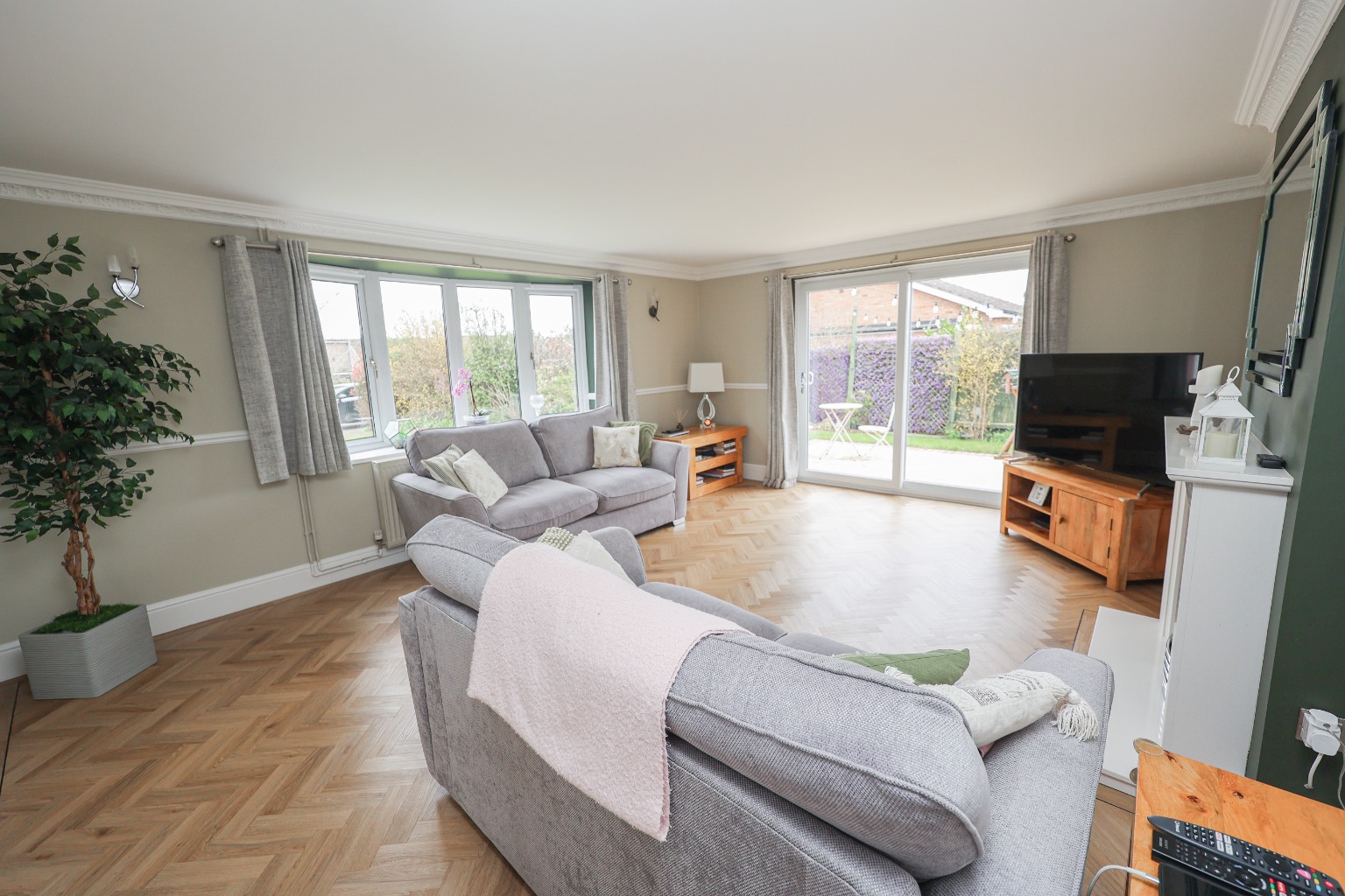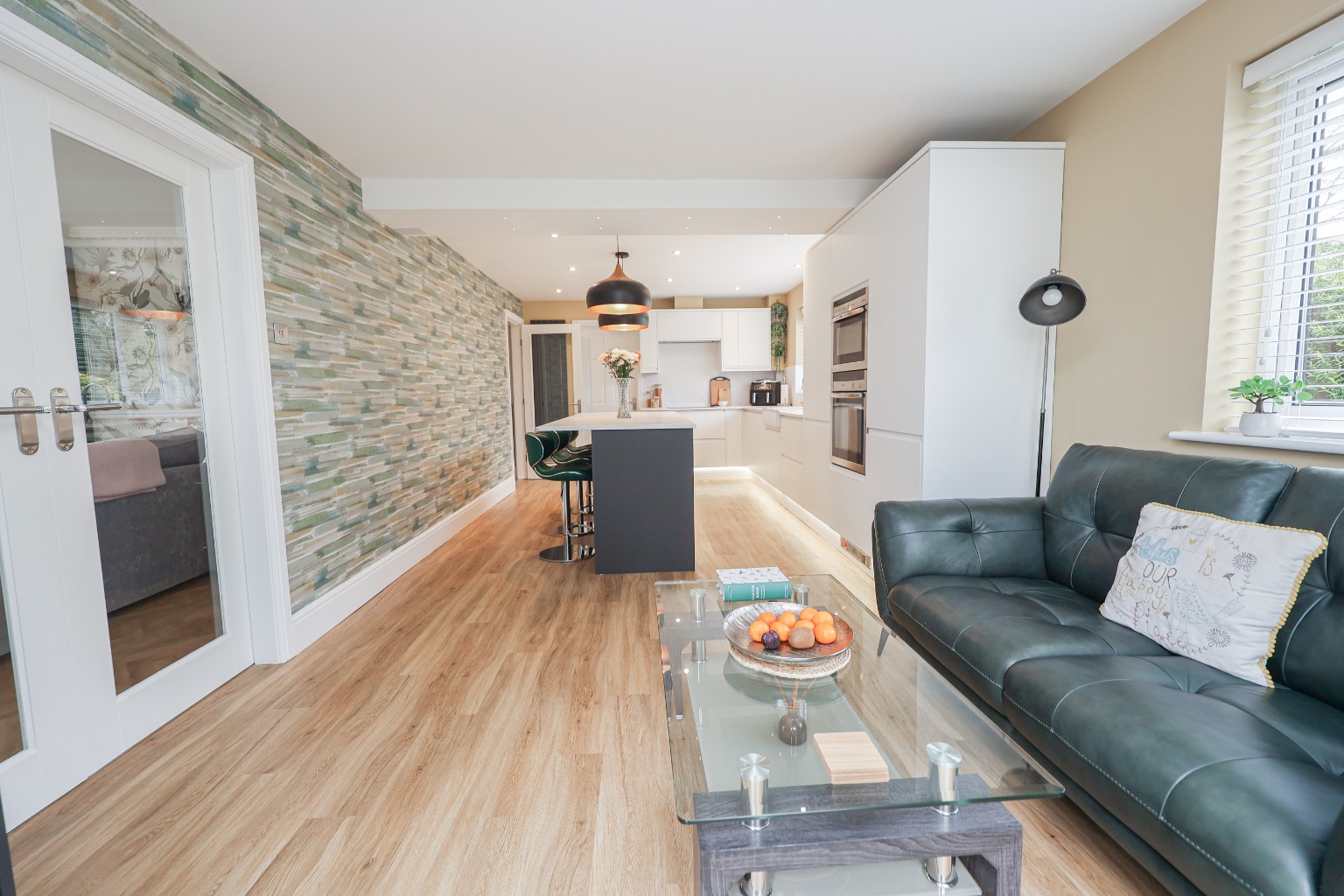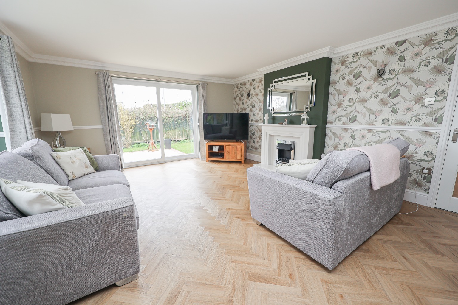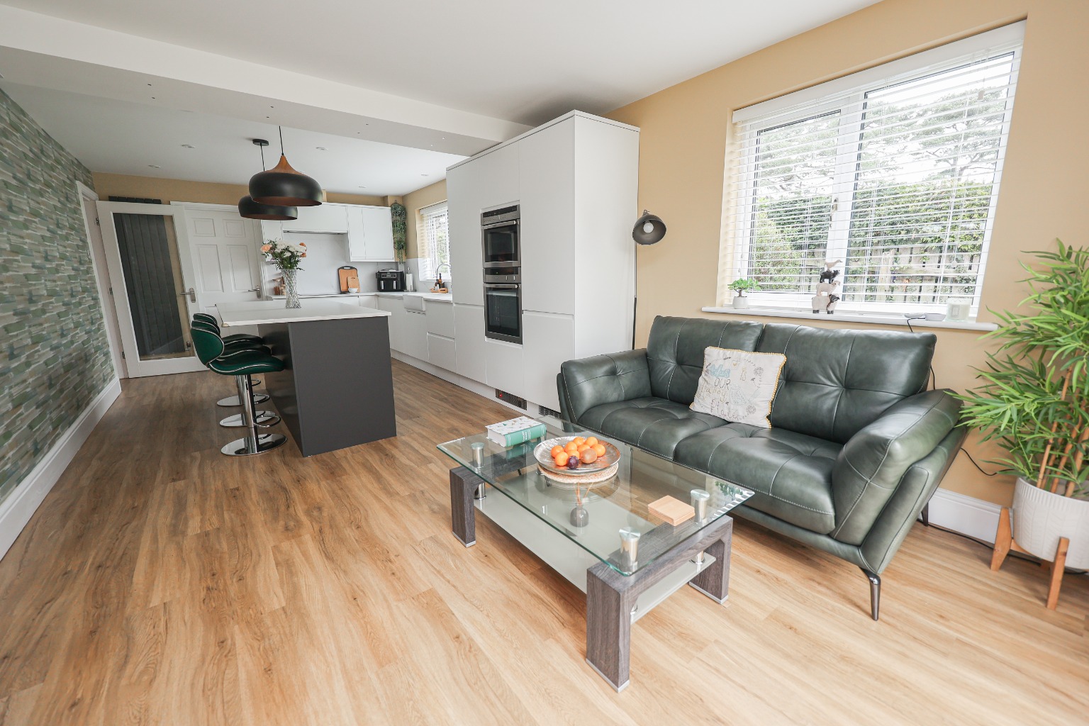 Entering through the front door, you are welcomed into a spacious entrance hallway, finished with solid wood flooring and a striking ash staircase, immediately setting a high standard for the rest of the home. The living room (5.38m x 4.37m) is a beautifully presented space, featuring a bay window to the front, a feature fireplace and patio doors opening out to the garden, allowing natural light to flood the room while creating a seamless connection to the outdoor space.