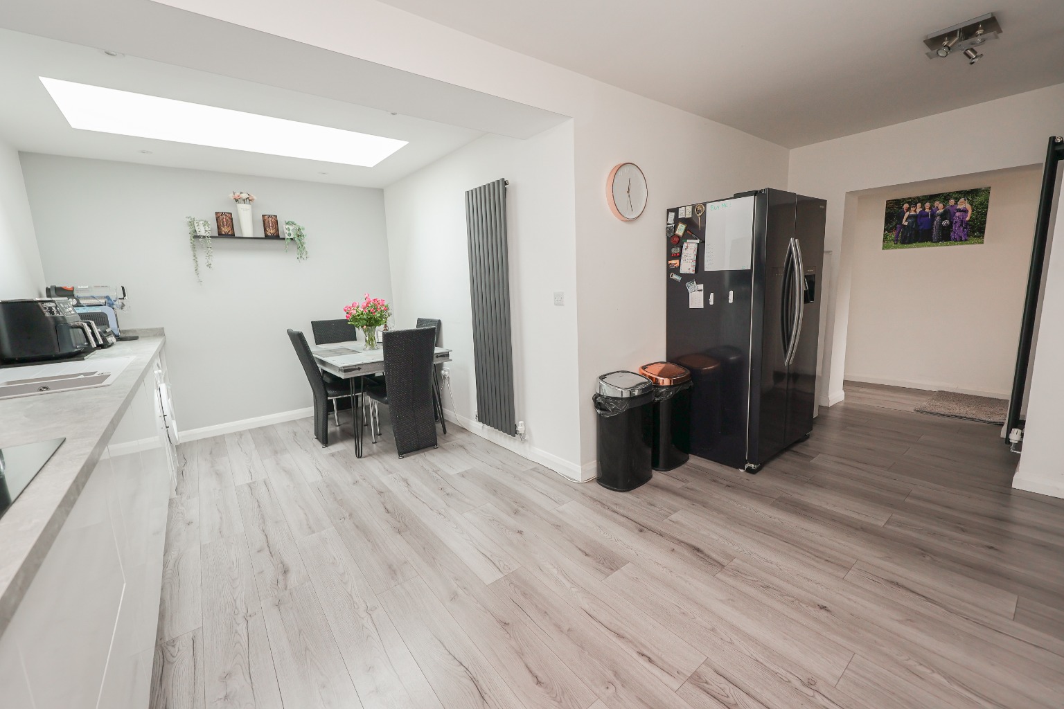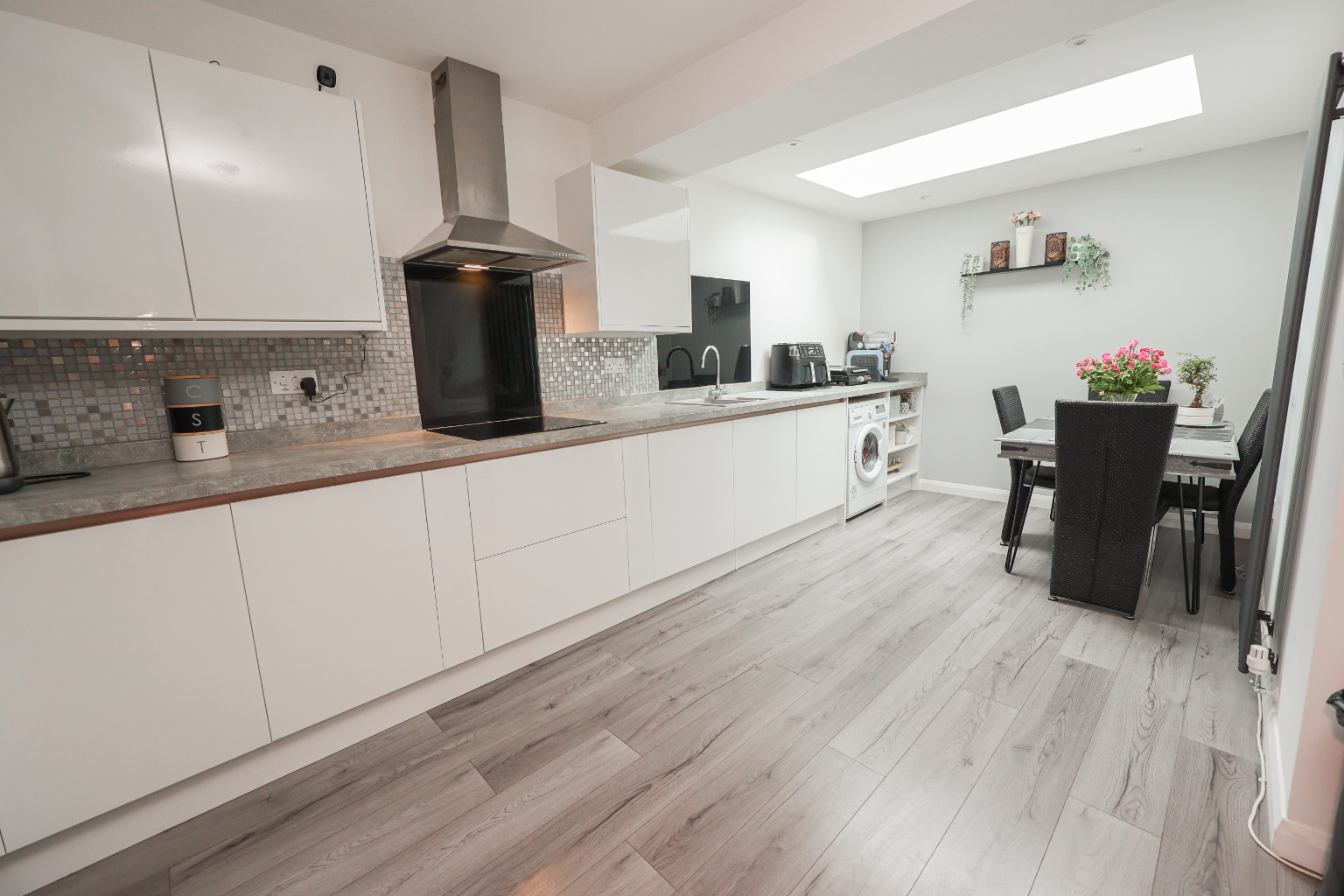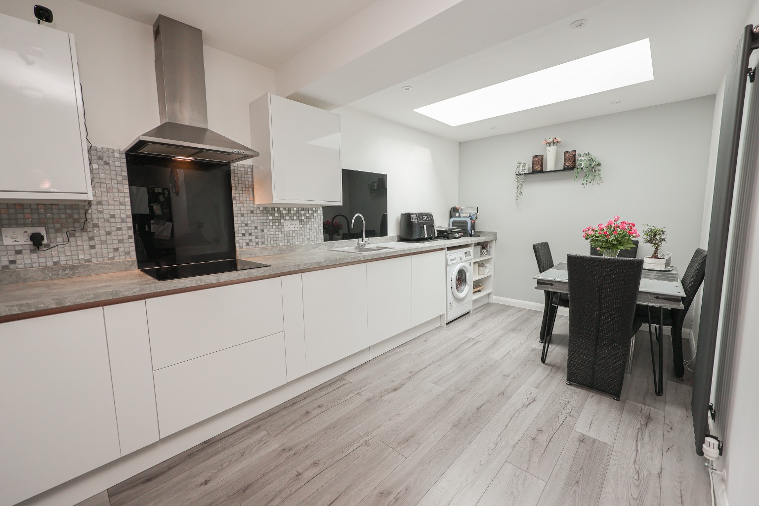 This sleek, stylish, bright and airy kitchen diner, has a range of matching wall and base units with worktops over, sink and drainer unit, hob and extractor fan, space for oven, space for microwave, space for fridge freezer, space and plumbing for washing machine, sky light, understairs storage area, and access through into the family room.