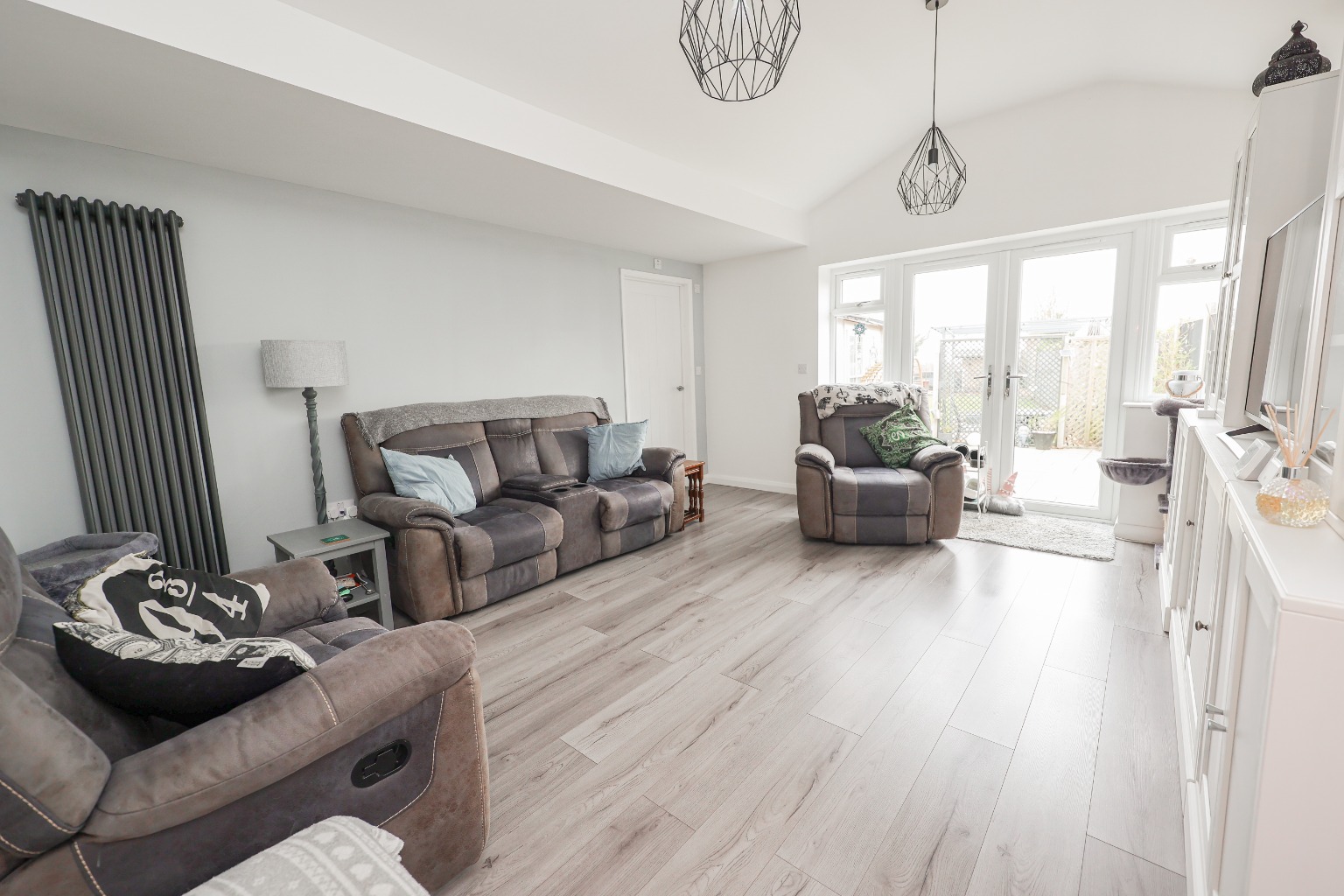 With laminate flooring, radiator, and french doors to the rear garden.