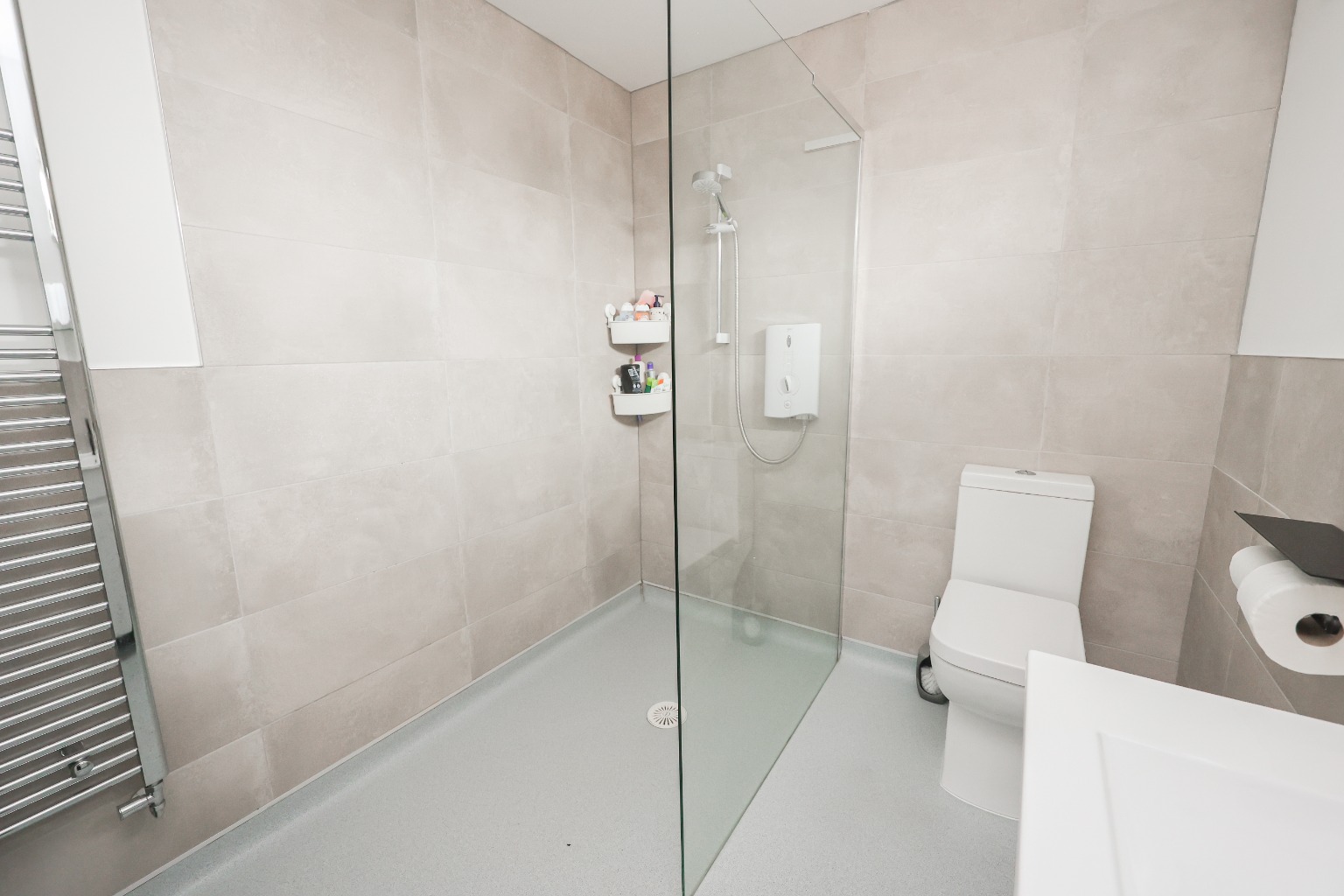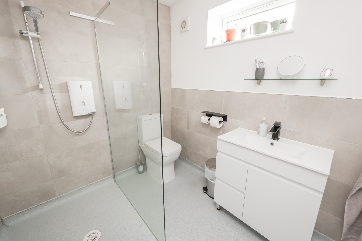 With three piece suite including walk in shower with shower oven, wash hand basin, low level flush wc, radiator, and window to the rear aspect.