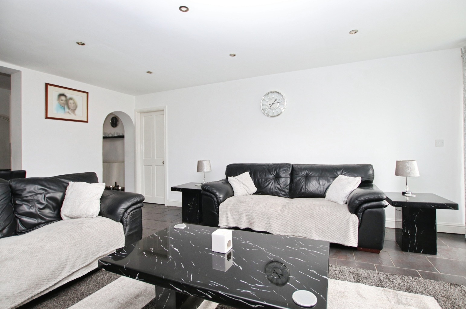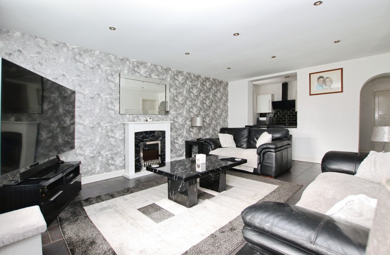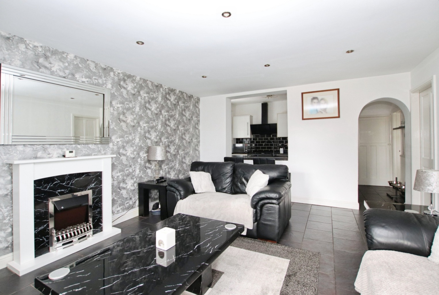 Open-Plan Lounge to Kitchen: Lounge area flows into kitchen; tile flooring throughout, UPVC-framed window, electric fire, TV point, radiator