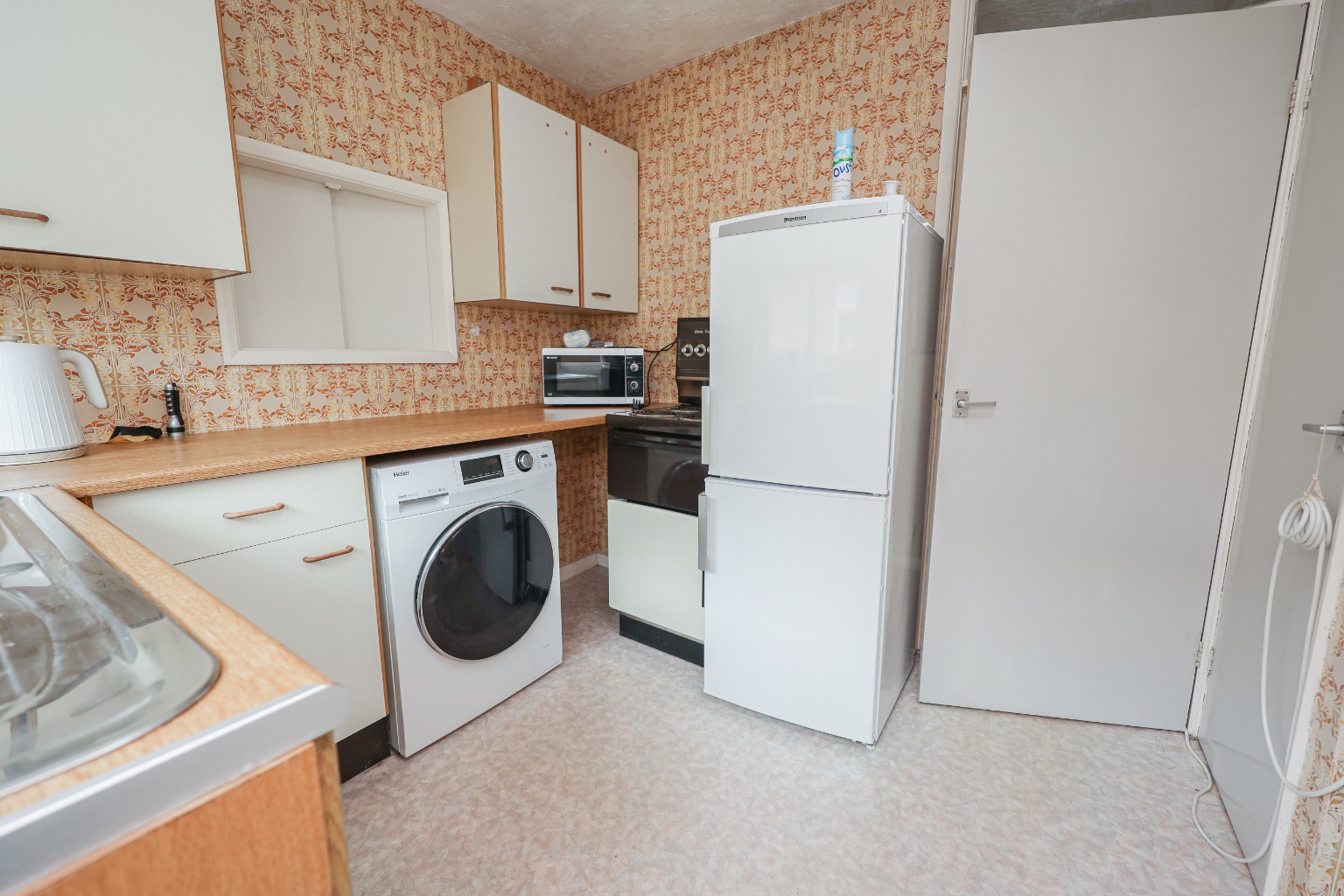 With range of matching wall and base units with worktops over, sink and drainer unit, space and plumbing for washing machine, space for fridge freezer, two storage cupboards, window to the side aspect and door to the side aspect.