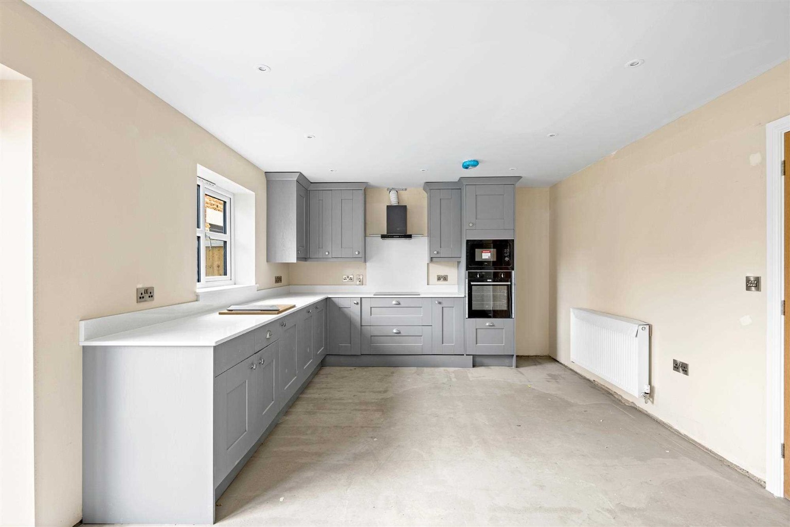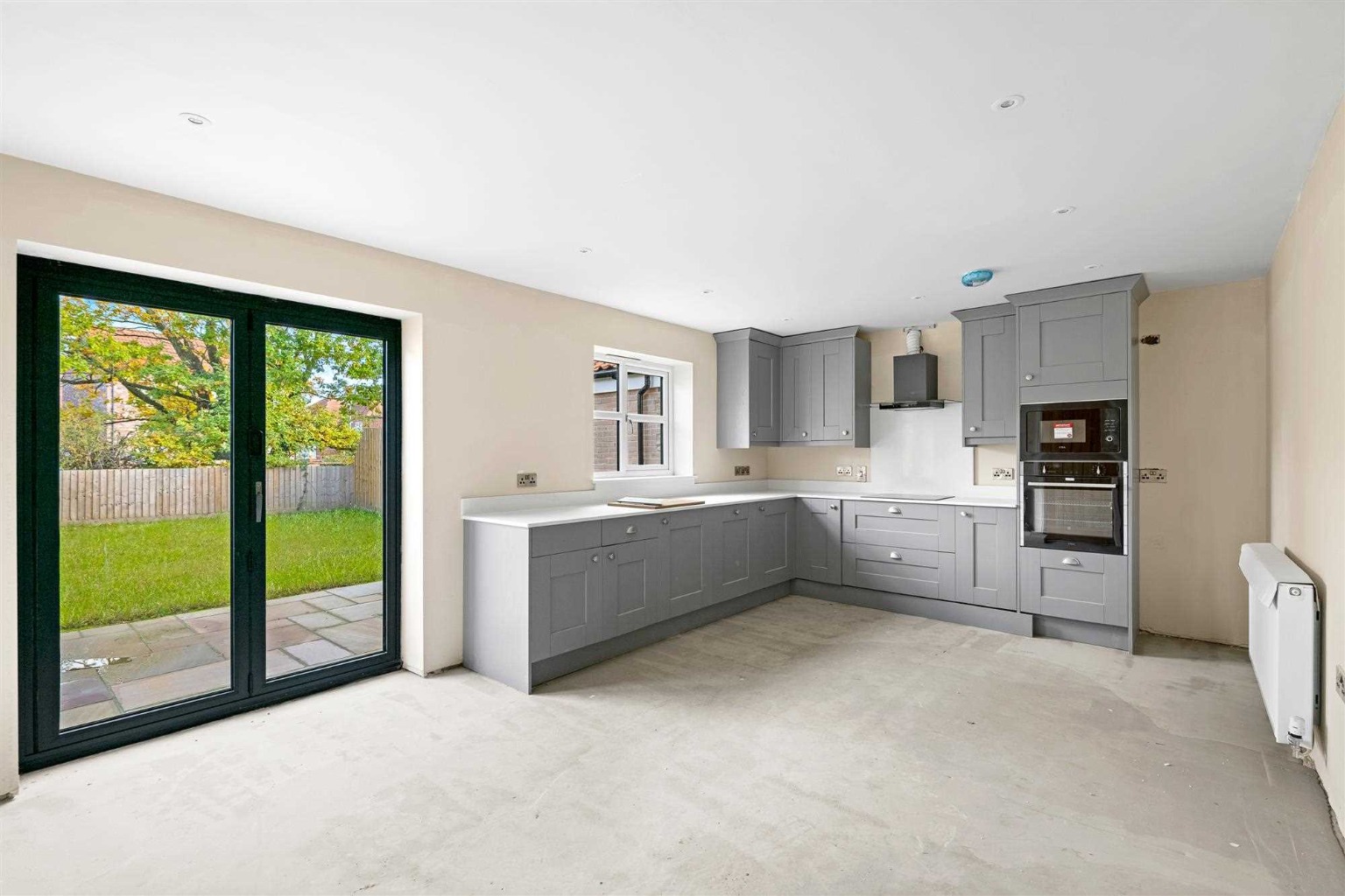 - Integrated appliances including oven, extractor fan, induction hob, microwave, and dishwasher