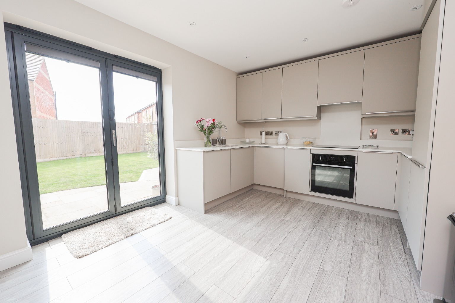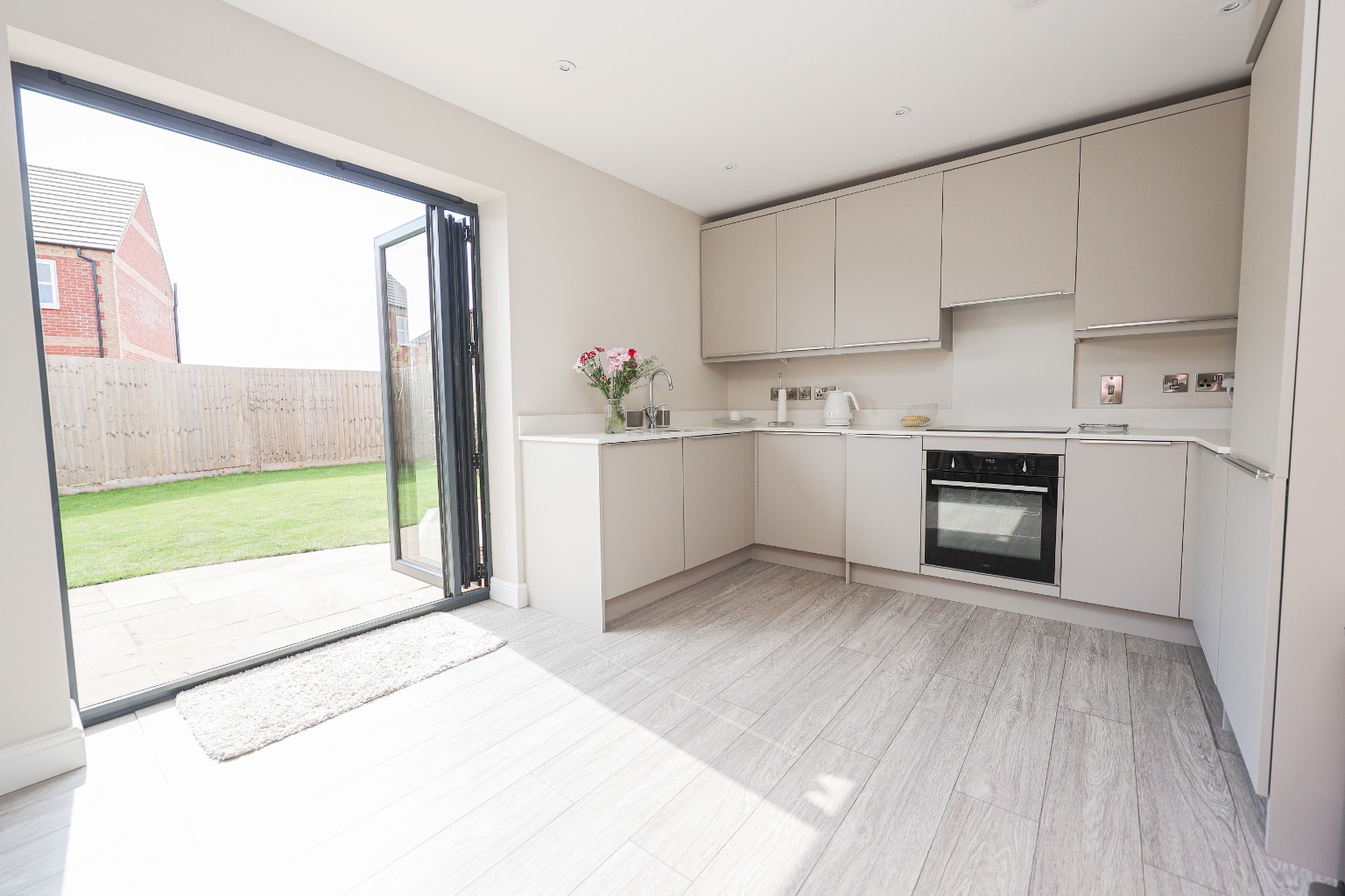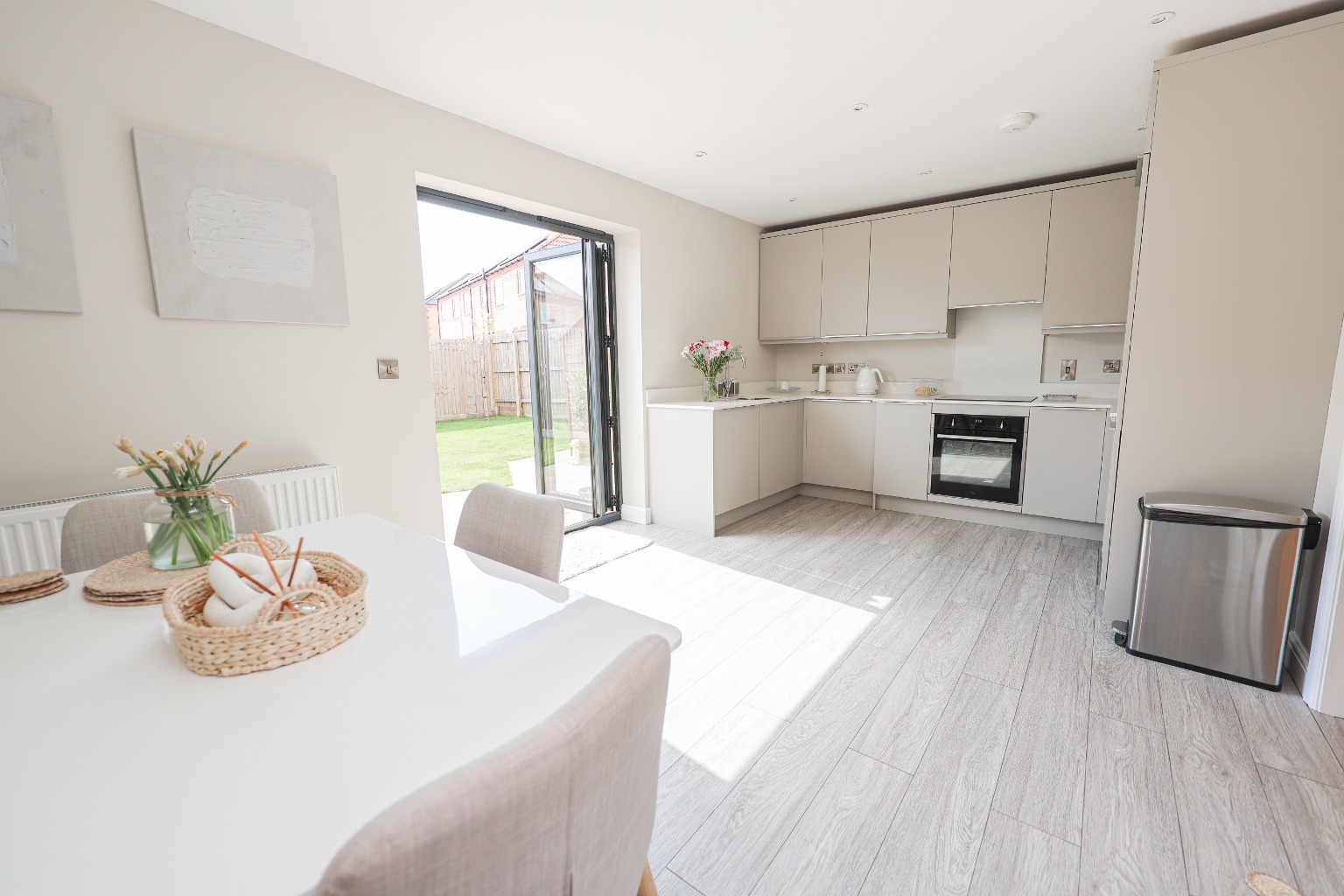 A contemporary kitchen fitted with sleek, handle-less cabinetry, quartz worktops, and integrated oven, microwave, induction hob, extractor fan, and dishwasher. The dining area enjoys direct access to the rear garden via bi-folding doors, flooding the space with natural light and making it ideal for indoor-outdoor living.