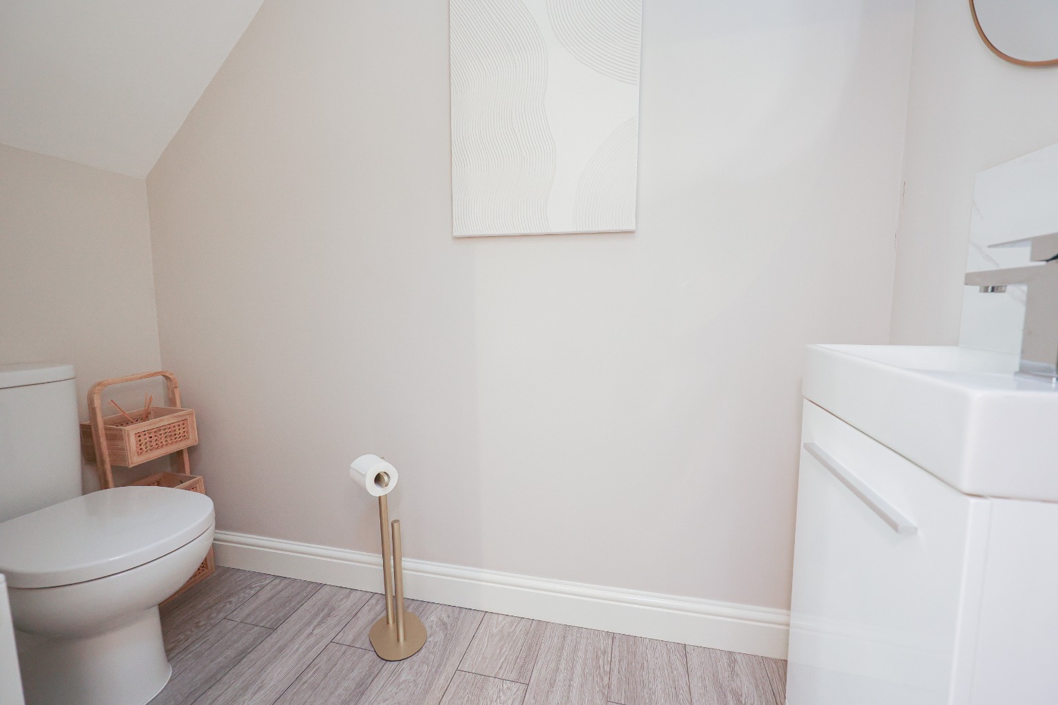 Conveniently positioned cloakroom with tiled flooring, WC, and wash basin with vanity storage.