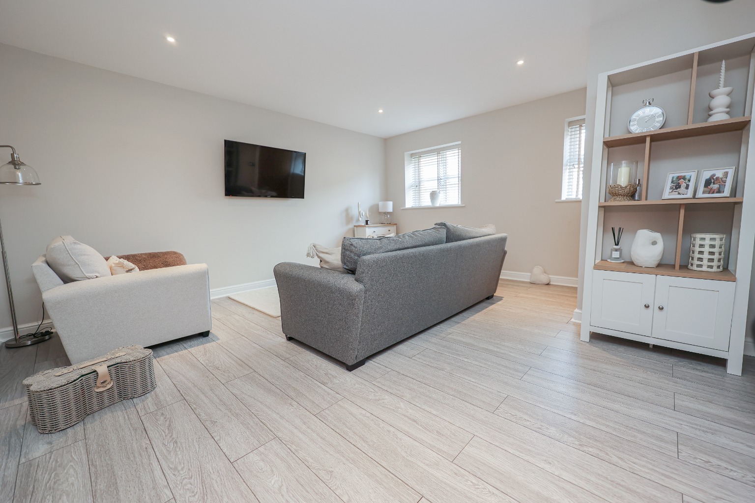 A light-filled living space with twin front-facing windows, neutral décor, high-quality laminate flooring, and ample space for multiple seating arrangements. A perfect retreat for cosy evenings or family time.