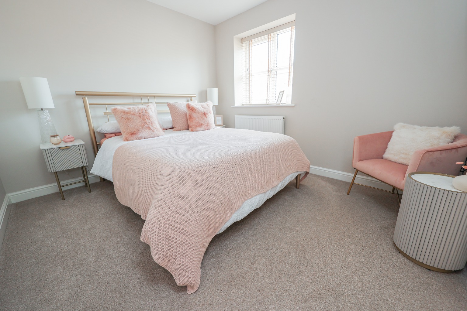 A generous double bedroom with a rear-facing window, soft carpet, fitted wardrobes and a light neutral palette — ideal as a guest room or child’s bedroom.