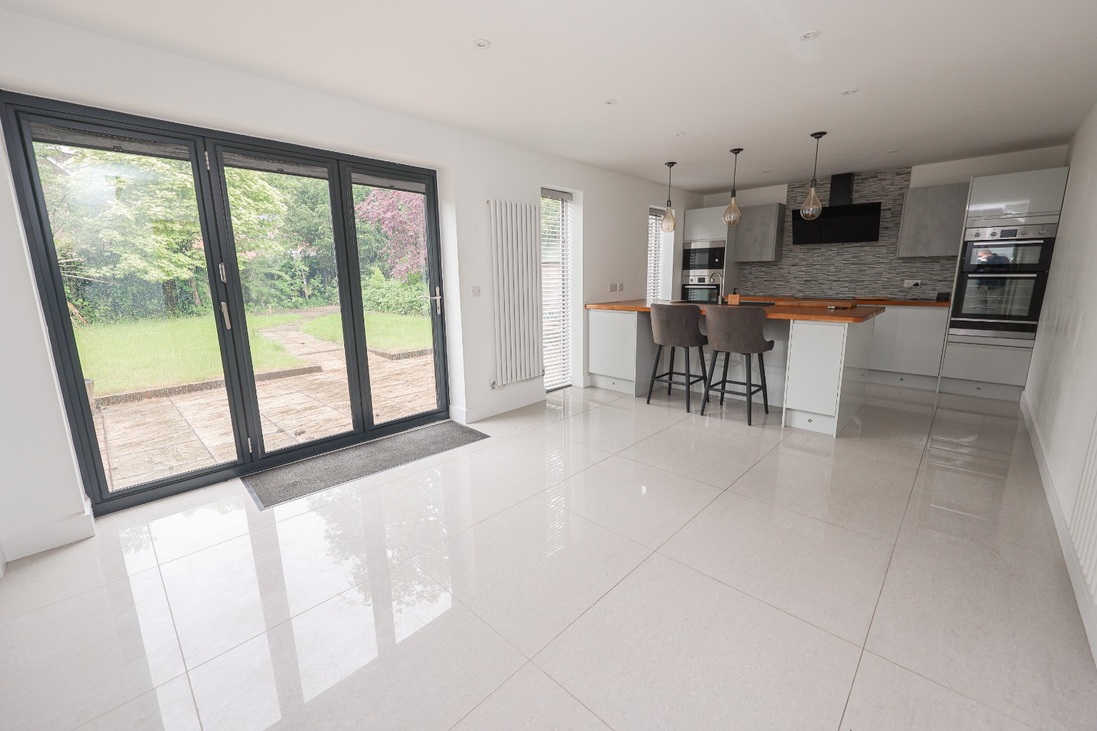 The heart of the home — this beautifully extended open-plan space includes solid oak worktops, high-spec appliances (including double oven, single oven, warming drawer, microwave, dishwasher, fridge & freezer), and bi-fold doors opening to the rear patio. Perfect for entertaining