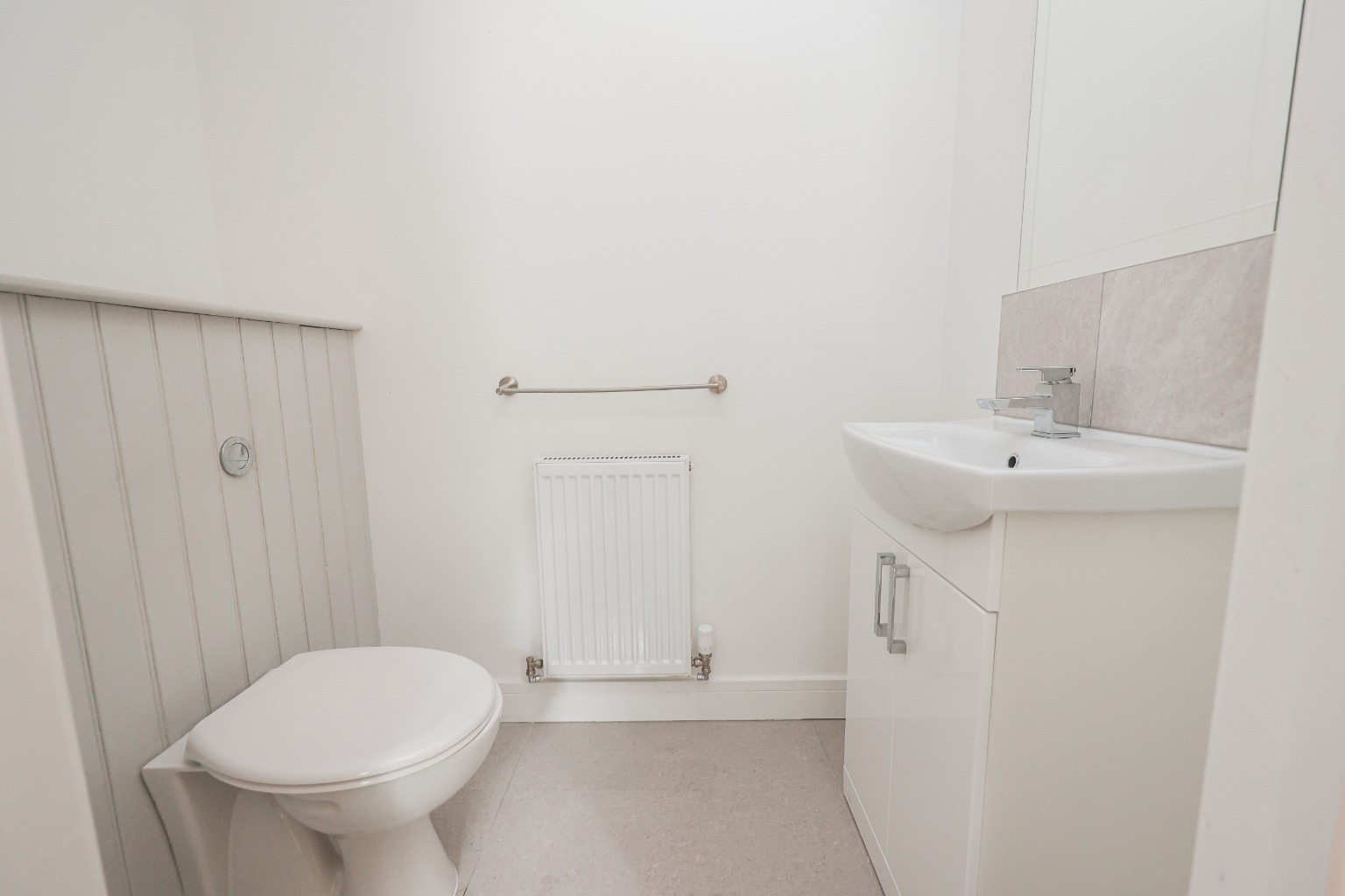 Convenient WC and hand basin with tiled splashback and extractor fan.