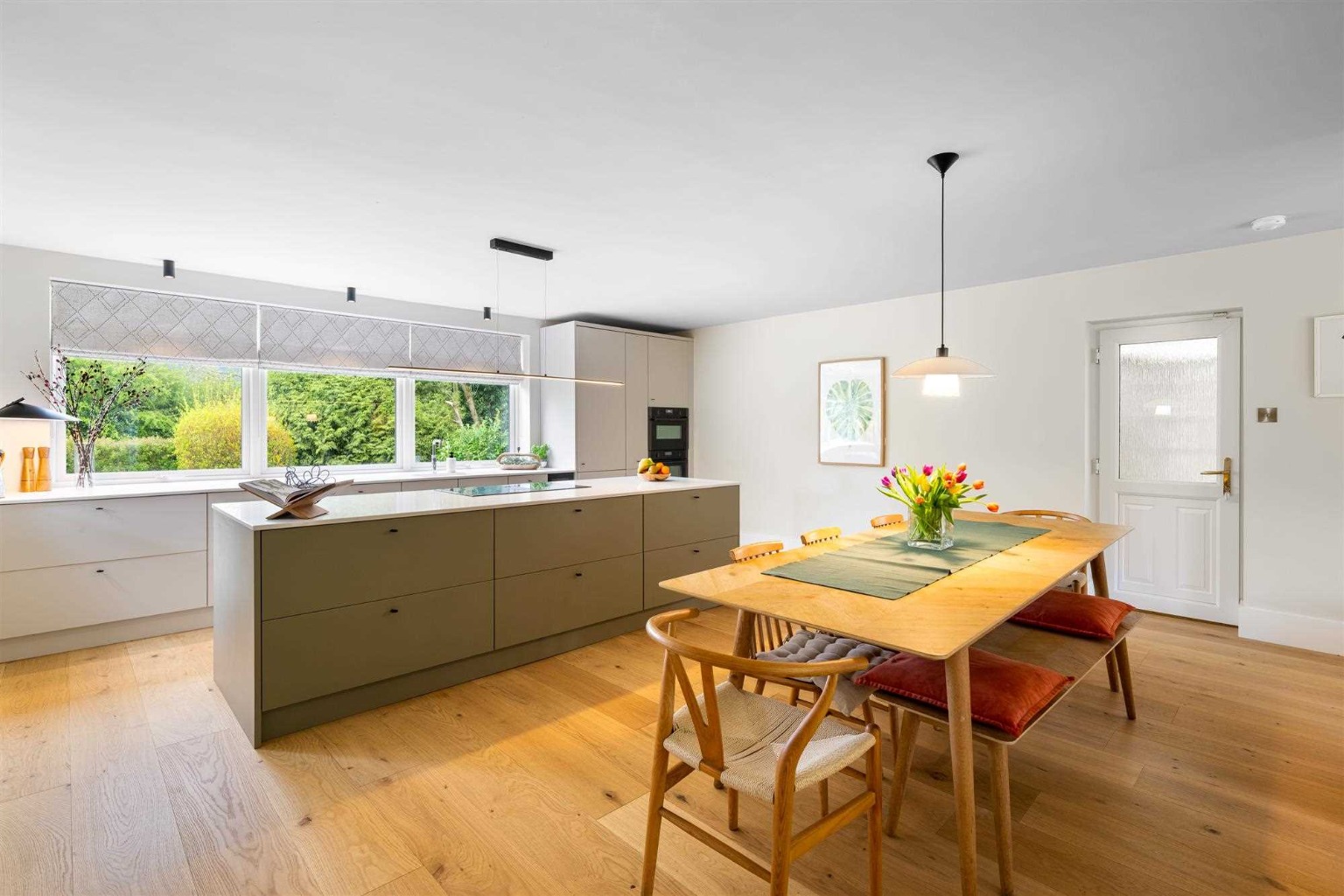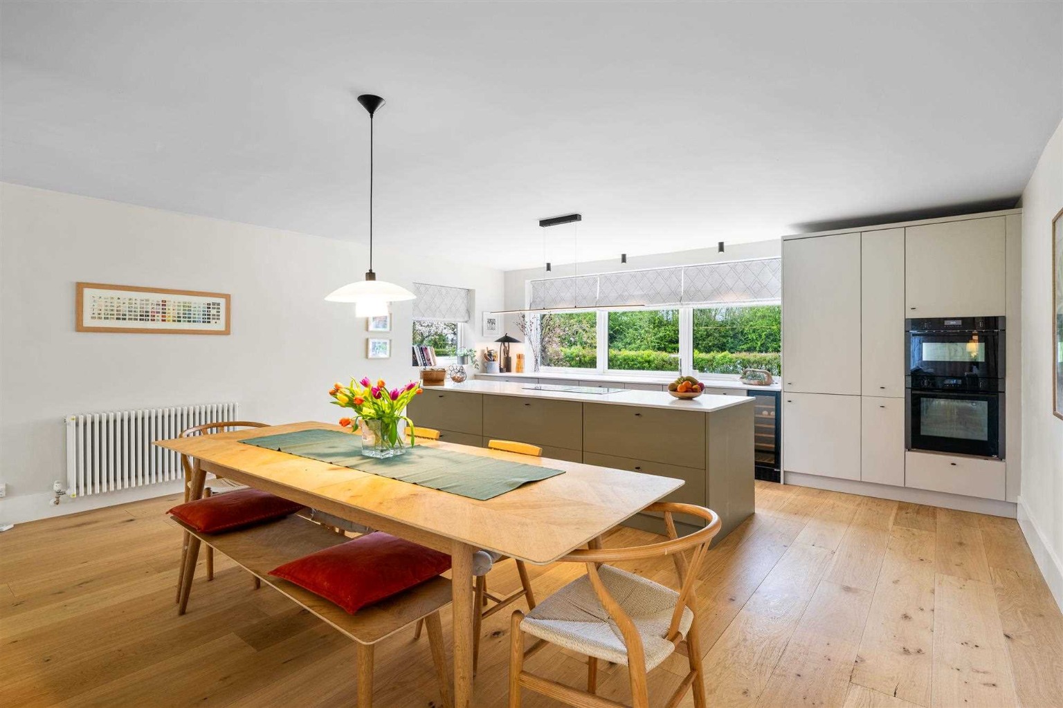 At the heart of this home is a newly installed Wren kitchen, a standout feature of the renovation. Valued at over £20,000, the two-tone kitchen from the Infinity Plus range is a dream for any home cook. It features fully integrated appliances, including a Neff oven, AEG venting induction hob, wine cooler, Quooker boiling water tap, dishwasher, and fridge freezer. Quartz worktops with an undermount sink add a touch of luxury, while the large central island provides extra workspace and storage, making it as functional as it is stylish.