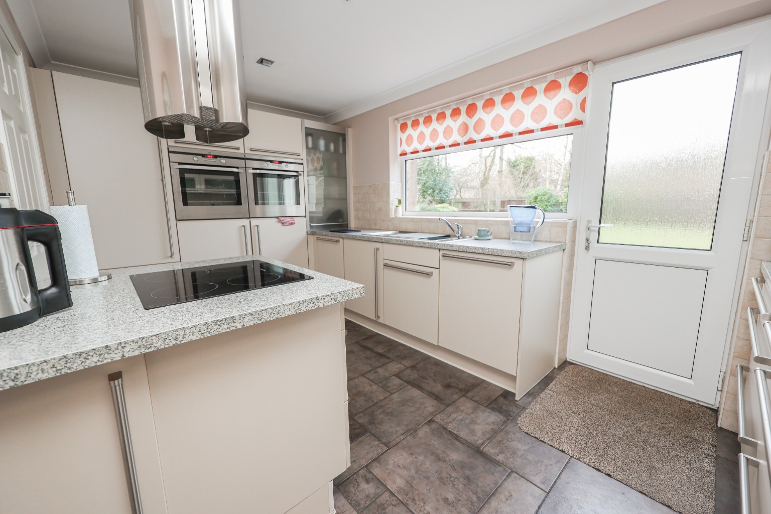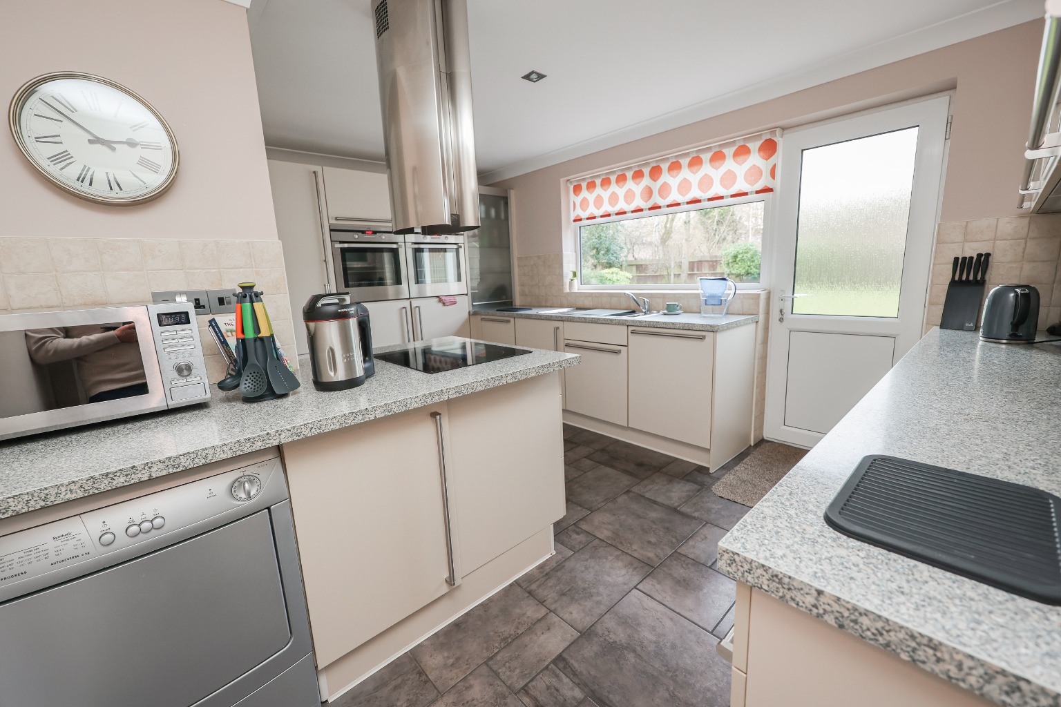 Well-equipped kitchen featuring a range of wall-mounted cupboards, including glazed display units, roll-edge work surfaces, and complementary base units. Stainless steel sink and drainer with mixer tap and tiled splashbacks, integrated dishwasher and washing machine, two integrated fridges, inset four-ring induction hob with stainless steel extractor hood, two built-in double ovens, complementary wall and floor tiling, and a part-glazed door leading to the rear garden.