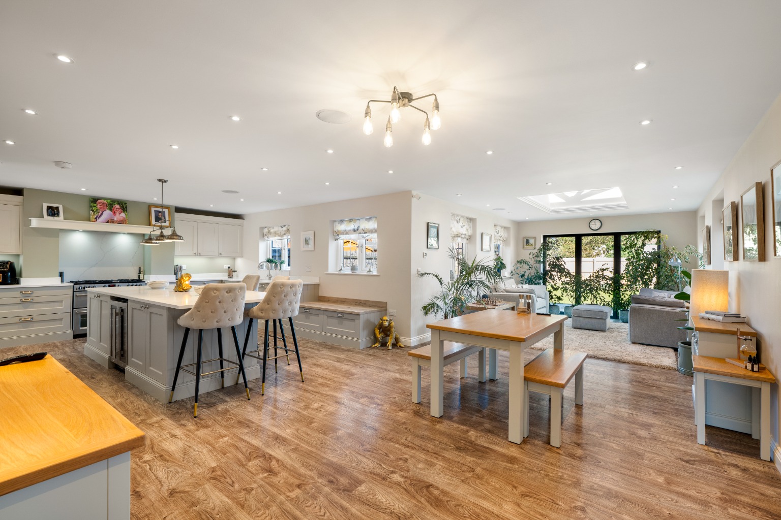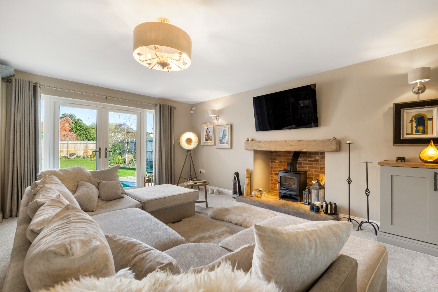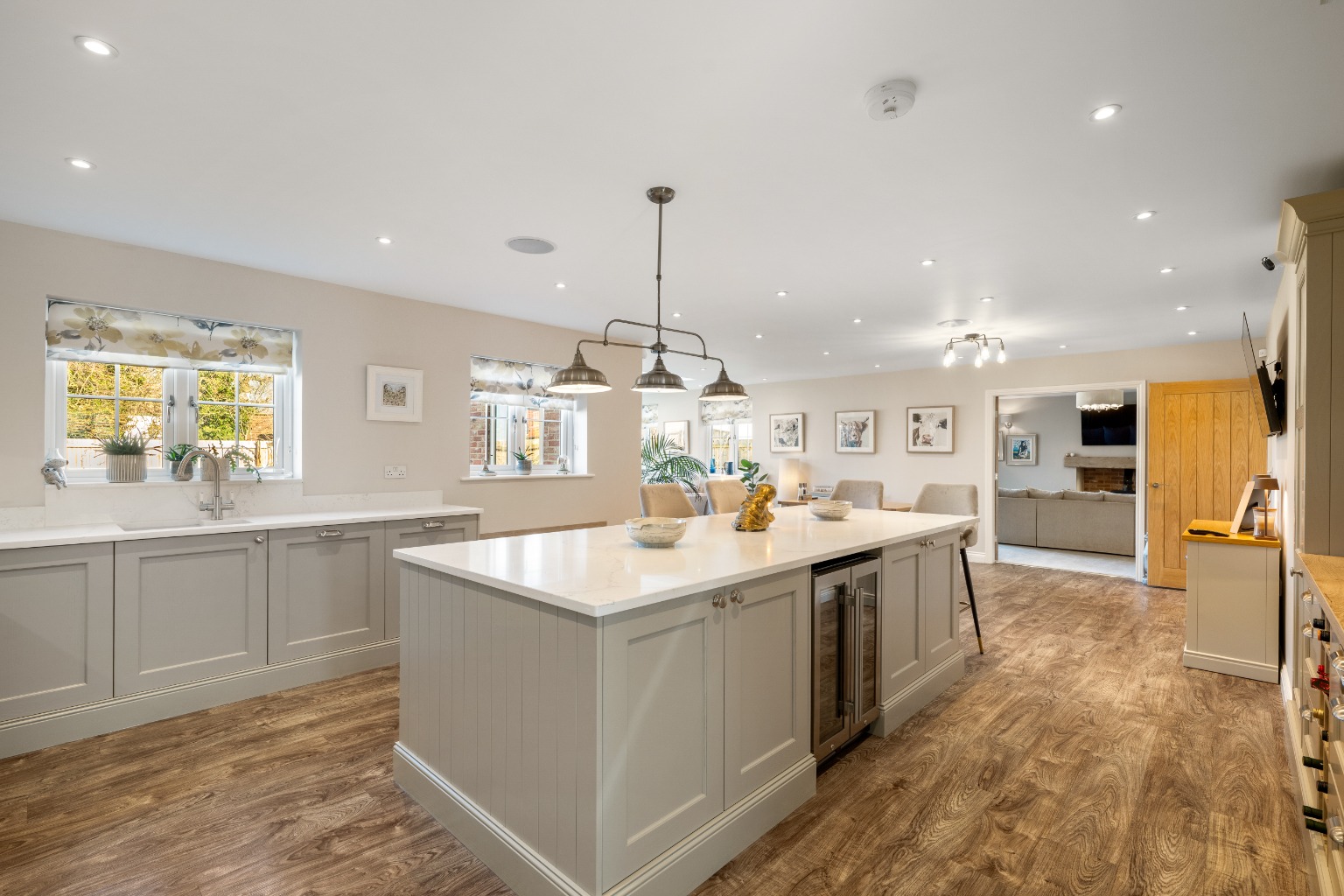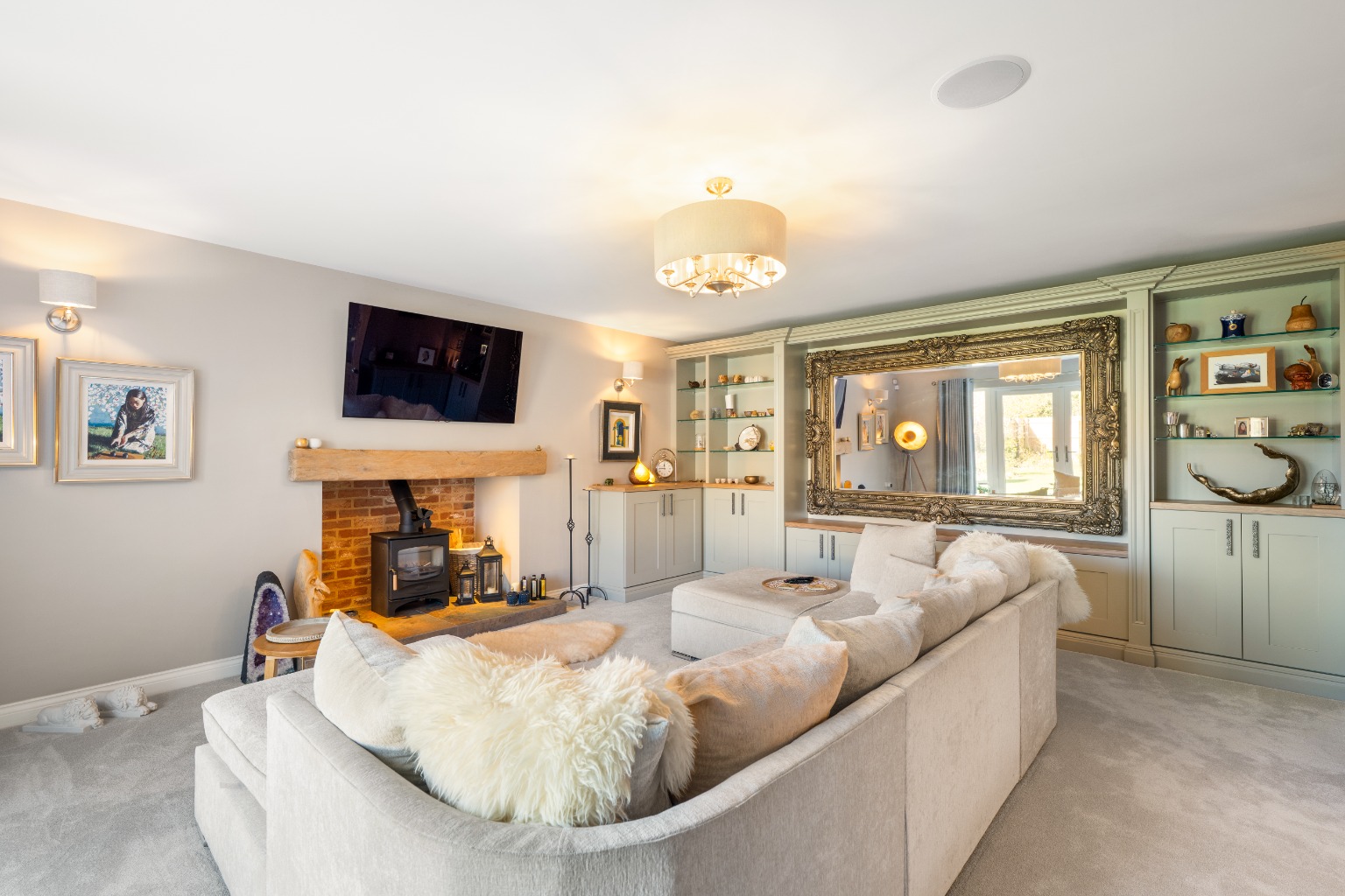 Internally, the property offers expansive and versatile accommodation spread over three floors. The ground floor features premium LVT flooring throughout (excluding the lounge, which benefits from a plush cream carpet), with underfloor heating powered by a gas boiler. A welcoming entrance hall leads to a spacious sitting room with a traditional exposed brick fireplace, log burner and bespoke designed cabinets, a generous kitchen/dining/family area fitted by local specialists LN Kitchens, and a charming garden room with aluminium bi-folding doors and roof lantern. The kitchen has been finished to an exceptional standard with Fugen Avalanche Quartz worktops, shaker cabinetry, a ceramic undermount sink, Qettle boiling water tap, Belling Farmhouse gas range cooker, full-height integrated fridge and freezer, and wine cooler. To the first floor are five double bedrooms, including a luxurious principal bedroom with built-in wardrobes and a three-piece ensuite. The family bathroom is beautifully appointed with traditional panelling, a freestanding bath, walk-in shower, and modern vanity units.A solid oak staircase leads to the second floor, where a striking 23ft x 16ft space offers flexibility for use as a sixth bedroom, cinema room, or games room, along with an additional 16ft x 8ft storage room. One of the rooms on the first floor has been kitted out with high quality storage and office solutions, making it the perfect working from home space.
