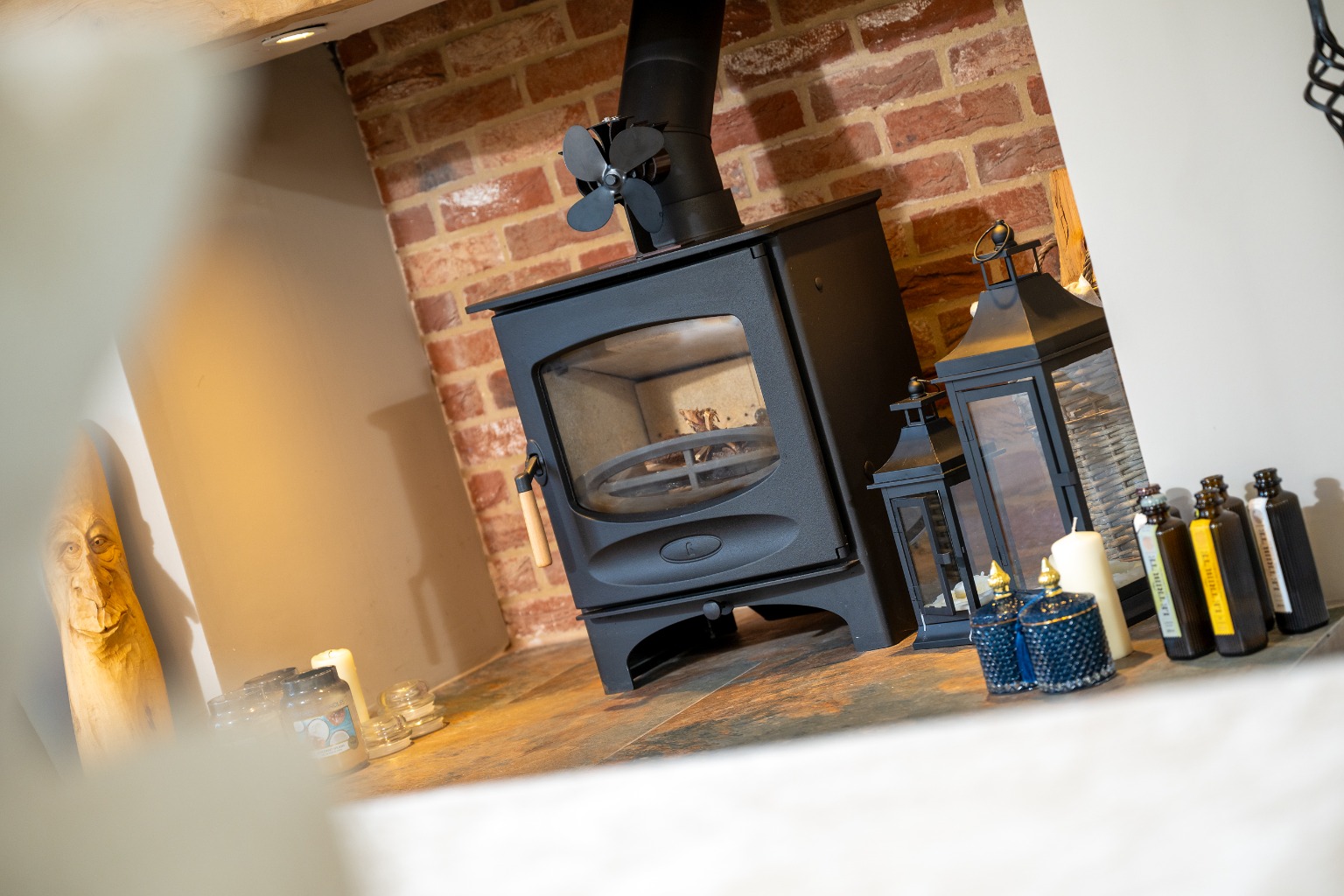 With feature exposed brick fireplace, oak mantel and wood-burning stove, fitted bespoke cabinets and furniture, fitted carpet and patio doors to garden.