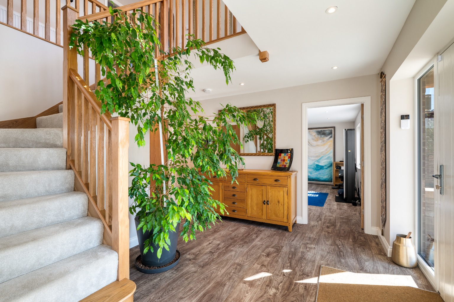 Flooded with natural light via full-height glass side panels surrounding the front door. Solid oak staircase rising to first and second floors.